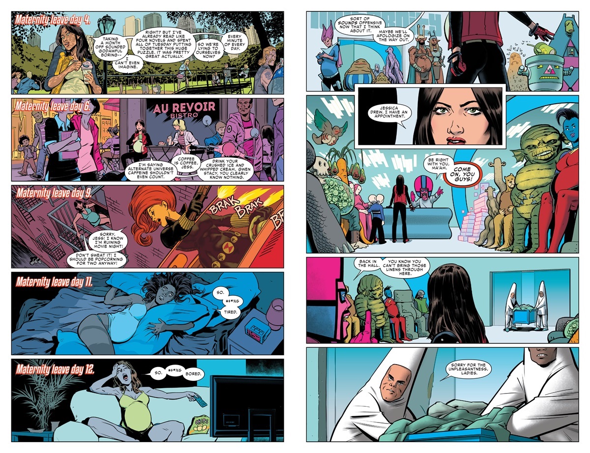 Hopeless, akinek éppen tavaly ikrei születtek, saját élményekből gazdagítja a sztorit, ami az új Astonishing Ant-Man hangulatához hasonlóan, könnyed, vicces, szórakoztató, és számos mellékkaraktert felvonultat a kevésbé komolyan vehető hősök és szupergonoszok közül. Remek, hogy a többi hős mennyire nem tud mit kezdeni az óriási pocakkal, érzelmi hullámvasúton ülő Jessicával Tony Stark buliján, és milyen szívet melengető, ahogyan Hawkeye humorosan a helyére teszi a helyzetet. Az eddig az újságíró Ben Urich és a pártfogoltjaként kezelt Porcupine segítségével jobbára utcai ügyekkel foglalkozó Spider-Womannek a komplikációkat megelőzendő intergalaktikus szülésznőhöz kell mennie, és a képregény itt átlép egy igazán eszement sci-fi mederbe.