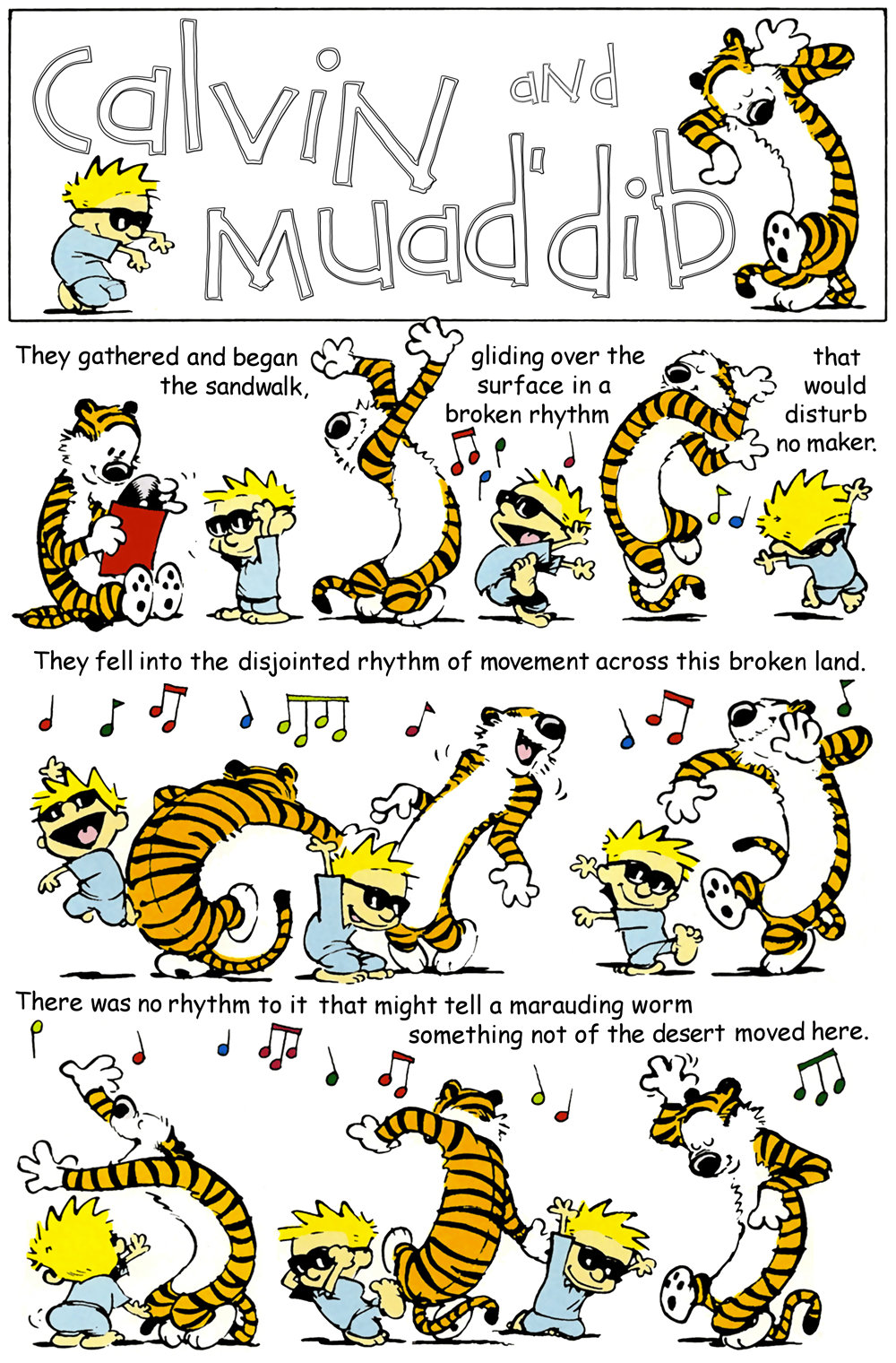 A nem csak a nagyvilágban, de kis hazánkban is mindenki által szívébe zárt rosszcsont filozófus, Kázmér és képzeletbeli (plüss)tigrise, Huba ezúttal a Dűne univerzumában elmélkedik a lét nagy kérdéseiről, méghozzá Bill Watterson hivatalos hozzájárulásával. Ez nem kis szó, hiszen a képregényszereplő páros kultikus státuszt szerzett megalkotója még Allan Moore-nál is jobban rászolgált a visszahúzódó remete jelzőre, és talán az egyetlen ember a világon, aki elvi alapon tiltotta meg, hogy két világhírű karakterét bedarálja a merchandise-gépezet. Ezzel egyrészt a kétségbeesés szélére taszította az ügynökét, aki szerint a Kázmér és Huba pólók, bögrék és figurák eladásának részesedéséből mára saját szigetet is vehetett volna, másrészt az önmegtartóztatás és a megingathatatlan elvek utolsó szélmalomharcosává tette abban a világban, ahol Jim Davis és Charles M. Schulz már régesrég elesett.