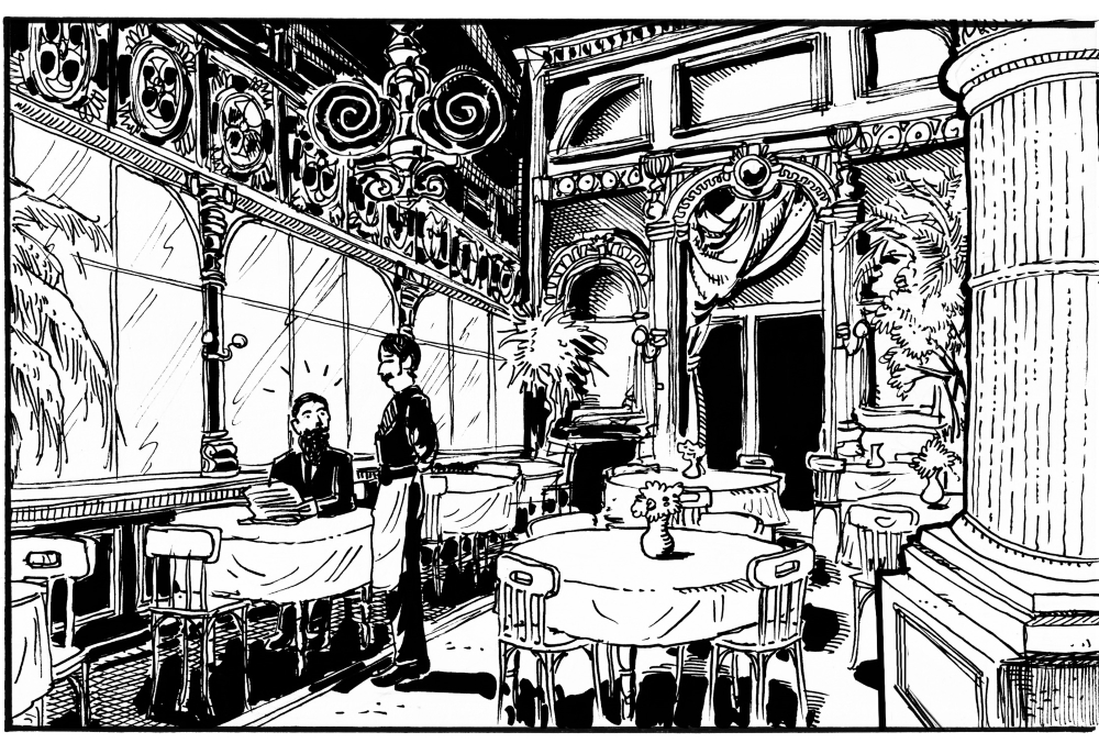 Semennyire. Skype-on beszéltünk, ő most Szombathelyen él, feljött Pestre, találkoztunk a két oldal miatt, elmondtam, mit szeretnék, Szabi lerajzolta, átküldte, én megírtam hozzá a szöveget, ő kicsit belenyúlt, hozzátett, és kész. Ugyanaz volt, mint múltkor: a két oldalon volt egy-két erősebb kép, ami megvolt a fejemben: az olyan lett, ahogy kértem, és volt, ahol Szabi keresett képet, pl. a kávéház belsőt. A nyomdai leadásnál volt pár álmatlan éjszakánk, de kinek nincs olyankor.