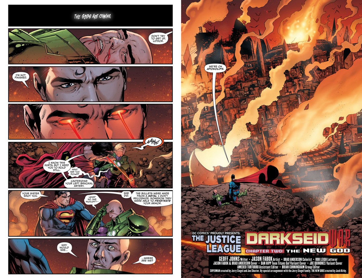 És végül muszáj, egyszerűen muszáj kitérnem egy bekezdés erejéig a DC mozis univerzumára, mert el kell végre oszlatni egy gyakran emlegetett tévképzetet, és soha jobbkor: a DC filmjeivel nem az a fő probléma, hogy (a Marvel könnyed hangvételétől eltérően) sötétek és véresen komolyak, hanem egyszerűen az, hogy rosszak. Az, hogy valami sötét és komoly, nem minőségi mutató, és erre a Darkseid War a legújabb remek példa – merthogy Johns egy abszolút sötét és komoly történettel rukkolt elő, és ez az abszolút sötét és komoly történet működik. Ennek titka egyszerű, ugyanakkor persze (főleg a világ Zack Snyderei számára) roppant nehezen megfejthető: jól van megírva. Mivel Johnst a Superman V Batman kudarca után a Warner egyik fejesével együtt a DC filmes univerzumának felügyelőjévé léptették elő (továbbá együtt írja az önálló Batman-filmet Ben Affleckkel), talán lesz annyi befolyása, hogy jó irányba terelje a dolgokat; hogy megőrizze a DC komolyabb hangvételét (Isten ments, hogy a Marvelt majmolják, márpedig biztosak lehetünk benne, hogy mostanában elég durván fontolgatják ezt az opciót), de gatyába rázza a történetmesélési osztályt.