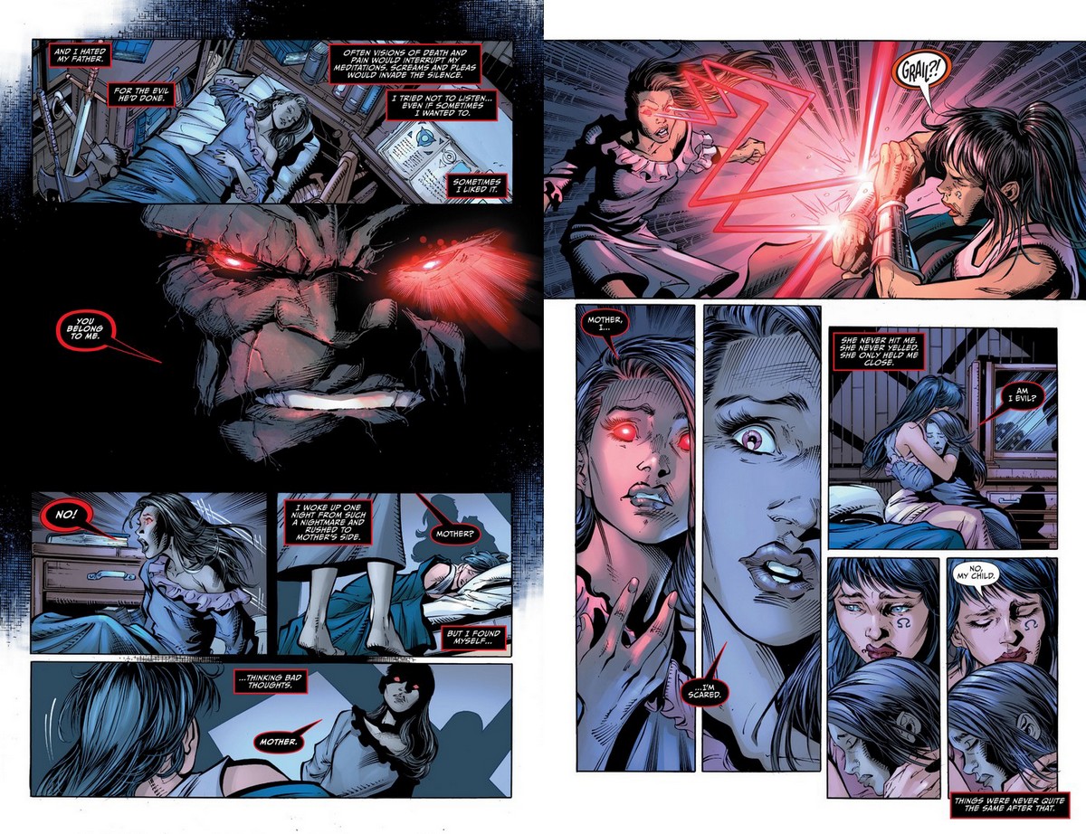 Kettőjükön keresztül válik világossá, hogy a címbeli konfliktus csupán monumentális háttér a Jó és a Rossz nem gigantikus robbanások között, hanem lelki síkon végbemenő csatájához és a nagy kérdéshez, amelyet végül a képregény oly katartikusan nem válaszol meg (vagy csak részben válaszol meg, és aztán új szintre emeli a kérdést): lehet remény egy gonosz isten sarja számára? Létezhet megváltás annak, akinek a DNS-ébe van kódolva a halálhozás és a pusztítás nem egyszerű kényszere, hanem egyenesen öröme? Annak, akit egész életében egy háborúknak véget vető háborúra készítettek fel? Johns, ahogy azt már tisztáztuk, nem a karakternüanszok embere, így a dráma éppenséggel nem hasítja szét a képregény lapjait, ellenben igazodik a dühöngő szuperhős/istenháború léptékéhez, és abszolútumokban nyilvánul meg: Wonder Woman a szeretet, Grail pedig a gyűlölet. Utóbbi legyőzheti karddal az előbbit, ám ez visszafelé nem igaz.