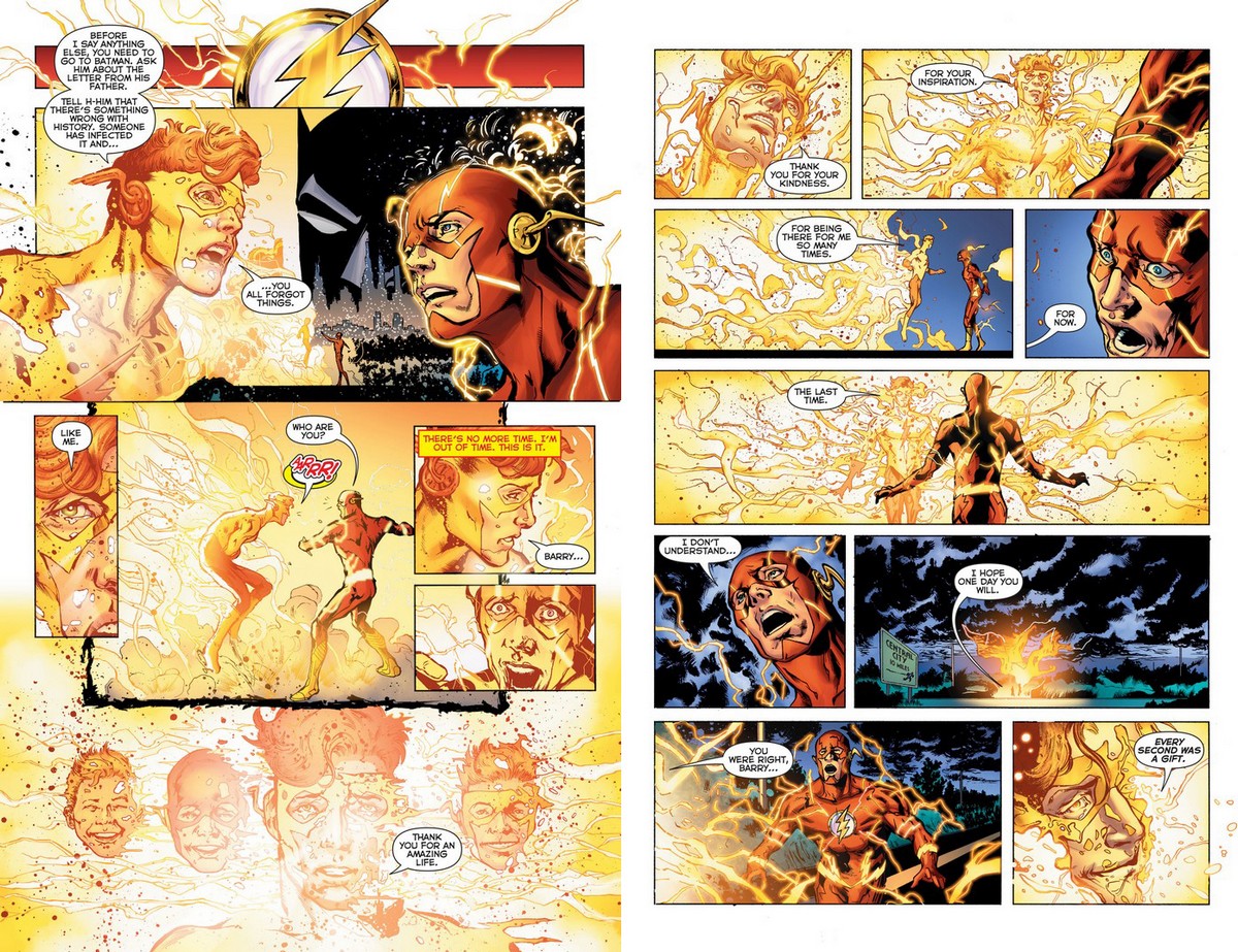 A Rebirth mint sztori (már ha annak vesszük) Geoff Johnsnak köszönhetően azért egész szépen működik: Wally fékevesztett vágtázása baráttól baráthoz iszonyatos lendületet, erőt és végzetszerűséget ad a képregénynek, érezni, hogy valami nagy és megfoghatatlan lapul az események hátterében. Ettől függetlenül eleinte úgy tűnik, Johns tényleg csak pipálgat, futja a kötelező köröket, hogy megágyazzon egy rakás későbbi sztorinak (Batman, Atom, JSA (!), Doctor Fate), de Wally és Barry találkozásakor végül sikerül egy olyan emocionális bombát robbantania, ami valamelyest kiemeli a képregényt a „kiadó logisztikai eszköze” kategóriából – lesz neki szíve. A DC nem titkolt (sőt hangosítóba harsogott) célja nem csak az, hogy visszahozza a Flashpoint előtti kontinuitást, hanem az is, hogy maga mögött hagyja a New 52 komorabb hangvételét, és megfürdőzzön némi rég elvesztett könnyedségben, humorban, felhőtlen szórakoztatásban, Wally és Barry katartikus összeölelkezése pedig nagyszerű kiindulópont ehhez. És ez így eddig igazán rendben is volna.