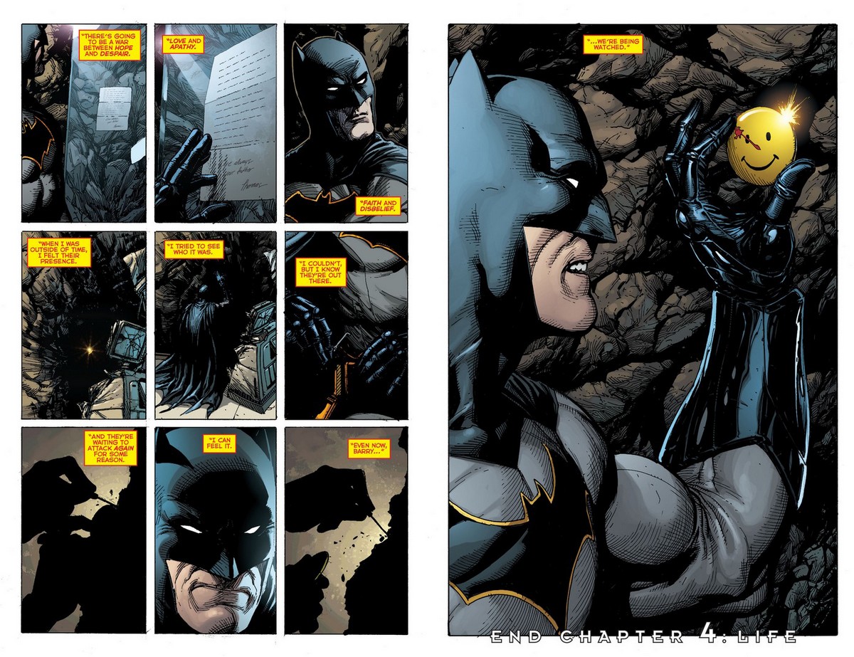 Sajnos azonban nem ér itt véget a képregény, sőt, hátravan még a főattrakció (itt most spoiler következik, bár kétlem, hogy akit kicsit is érdekel a téma, ne futott volna bele az utóbbi két hétben...). A DC nem csak a Flashpoint előtti kontinuitást hozza vissza, hanem beleszövi abba a Watchment is. Igen, azt a Watchment. Miért, van másik? Szóval ja, az Alan Moore-Dave Gibbons féle überóriásklasszikust, a médiumot, de legalábbis a szuperhősműfajt megújító Watchment. Rorschach, Dr. Manhattan és a többiek mostantól ugyanabban a világban léteznek, mint Batman és Superman.