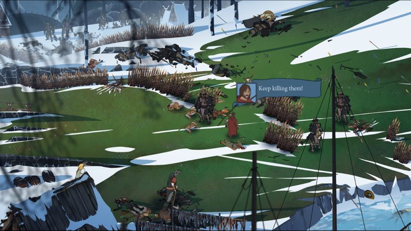 Vándorlásunk monotonitását különböző intermezzók színesítik, például más menekülőkkel találkozunk. Itt kell megemlíteni, hogy a fejlesztők nagyon ügyesen építették fel azt, hogy a helyzet egyre elkeseredettebbé válásával egy időben az emberek egyre gátlástalanabb cselekedetekre vetemednek. Előfordulhat, hogy akiket jótékonyan befogadtunk, szépen lefalcolnak a készletünk egy részével. Vagy hátba támadnak minket. Az intermezzók másik célja, hogy a fent részletezett adatok ne csak sztálini értelemben vett statisztikaként működjenek. Amikor arról írtam a cikk elején, hogy a készítők, a háromfős Stoic csapat tagjai minden megoldás hátulütőjét megpróbálták kiegyenlíteni, éppen az ilyesmire gondoltam. A közjátékok újra és újra emlékeztetnek arra, hogy férfiak, nők és gyerekek utaznak velünk, és az ő életük a mi döntéseinktől függ. Persze ezt sosem az orrunk alá dörgölősen teszik, hanem finoman adagolva, hogy amikor az egyik pillanatról a másikra elvesztünk pár száz klánunkbelit, gyomrosként szembesüljünk azzal, hogy ez egész családok kiirtását jelenti. A The Banner Saga pedig ilyen szempontból kifejezetten gonosz, lassan terelget a felismerés felé: nem menthetünk meg mindenkit. Érdekes, kettős játéknak leszünk az alanyai. Egyrészt folyamatosan emlékeztetnek minket a számok mögött rejtőző apákra, anyákra és gyerekekre, másrészt arra próbálnak rávenni minket, hogy mindennek ellenére inkább számokban gondolkozzunk. Ez a folyamatos disszonancia zseniális érzékeltetése a Rook és Hakon vállaira nehezedő felelősség iszonyatos súlyának.