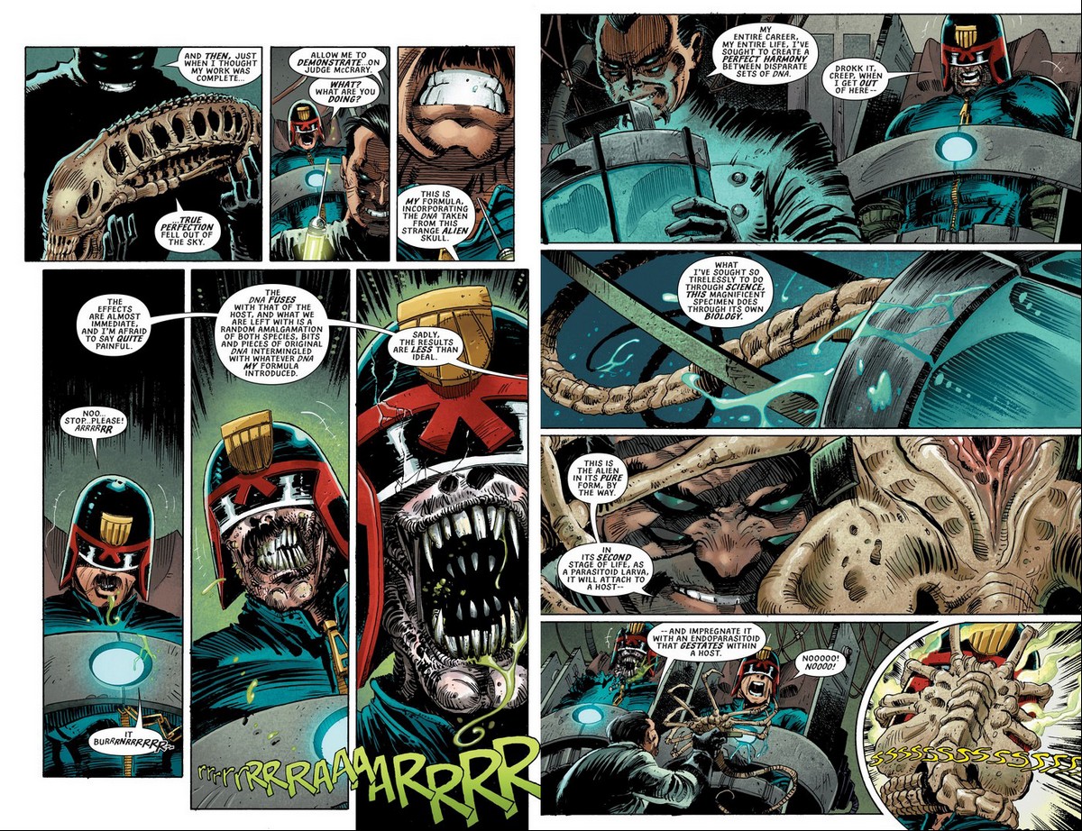 Olyannyira (és ez a vicc az egészben), hogy az első két rész alapján ez a képregény még xenomorfok és ragadozók nélkül is működne: Dredd és bírótársai (köztük Anderson) egy tébolyult, gyilkos kultuszt vezető emoji-robotot üldöznek a senkiföldjén, ahol aztán belebotlanak egy állat-ember hibrideket faragó, pók-DNS-sel felturbózott, őrült tudósba, afféle velejéig gonosz, posztapokaliptikus Dr. Moreau-ba. Mind ő, mind az emoticonokkal és netes szlenggel meg rövidítésekkel kommunikáló robot elég színes és markáns figurák ahhoz, hogy akár önmagukban elvigyenek a hátukon egy bizarr, szatirikus vonásokkal feldobott, pörgős, no-bullshit Dredd-sztorit. De Layman mindezt csak kiindulási pontnak használja.