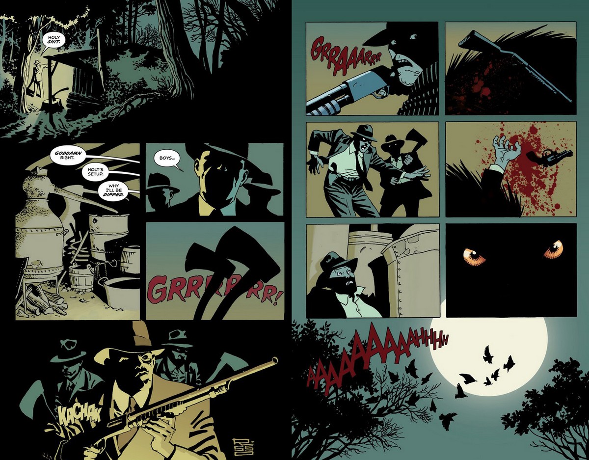 Óóóóóhhhh, az utolérhetetlen The 100 Bullets világbajnok gárdája új képregénysorozatba kezd… egészen korán jött idén a karácsony. Azzarello és Risso ráadásul ezúttal egyik kedvenc korszakomba, a ’20-as évek végébe, a szesztilalomba, a gazdasági válság idejére invitálnak, nyilvánvalóan szeszcsempészek, szövetségi ügynökök és gengszterek közé. Ja, bocsánat, valamit kihagytam: vannak még itt farkasemberek is, a Moonshine ugyanis a noir és a horror sajátos ötvözete. A nyitójelenetben kapásból valami szőrős rémség tépi szét az illegális üzelmek után vidéken szaglászó kormányügynököket, köztük Elliot Nash-t is, aki ebben a világban már nem fogja legyőzni Al Caponét.