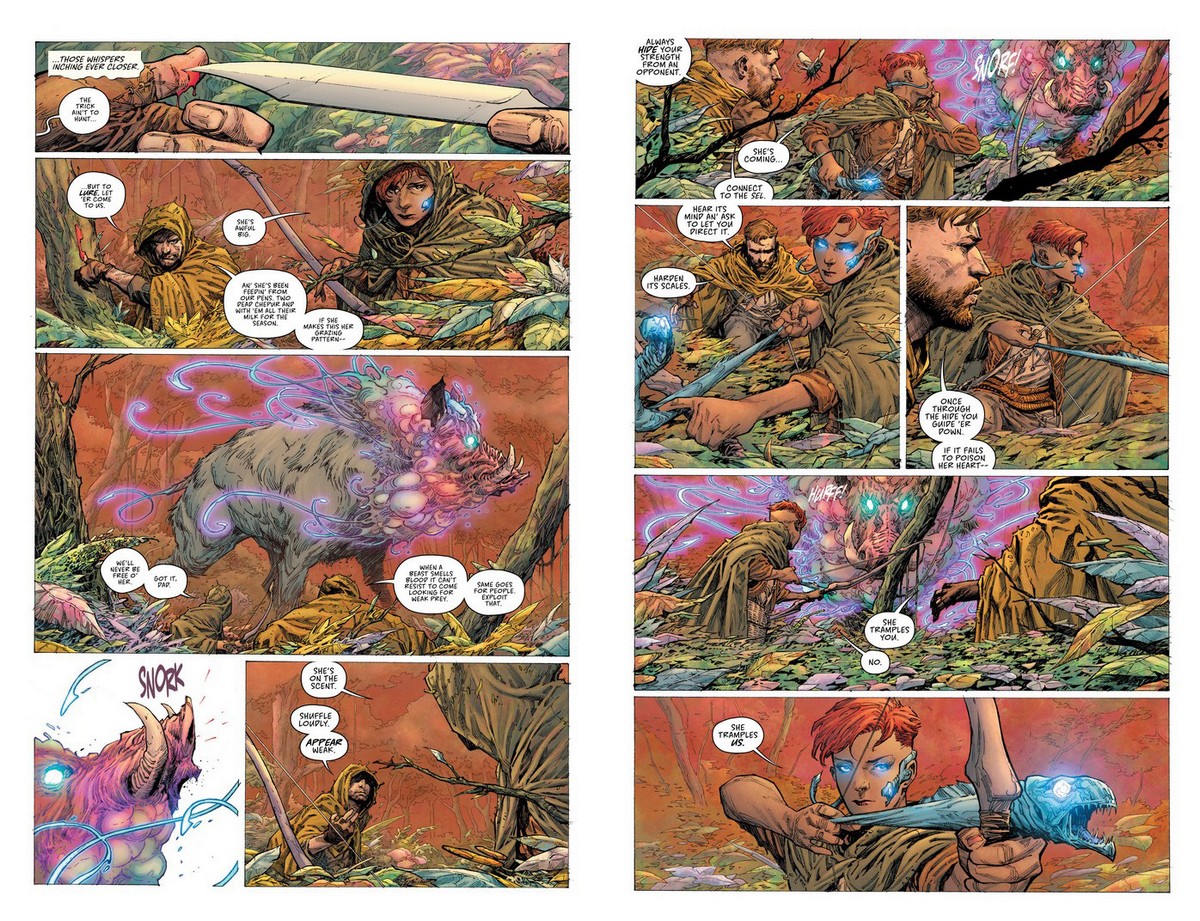 A sztorileírás azonban önmagában kevés, hogy kifejezze, milyen gazdag, őrült, komplex világot teremtett Remender. Mágikus képességek, félelem és paranoia, kapcsolat a holtakkal, rettenetes szörnyetegek, misztikus bestiák, és mindez egy lovecrafti vonásokkal és westernelemekkel beinjekciózott high fantasyben, amelynek középpontjában egy megviselt, de kemény, harcra kész, háromgenerációs család áll. Remender jó szokásához híven korán meglengeti a karakterkaszát, és eszében sincs fogni az olvasó kezét, sőt, mentőöv nélkül vágja bele a mély vízbe. Szedegesd csak össze te magad a félinformációkat, a magyarázat nélkül lábad elé szórt kifejezéseket, és következtesd ki az ábrázolt univerzum működésének törvényeit és mechanizmusait – ha tudod. Lefogadom, hogy beletelik még pár részbe mire teljesen megértjük Zhal világát. (Ennek persze megvannak a hátulütői is, konkrétan néha kicsit zavaros az első szám, de összességében tetszik ez az érett, fokozatos, cseppet sem szájbarágós világépítés.)