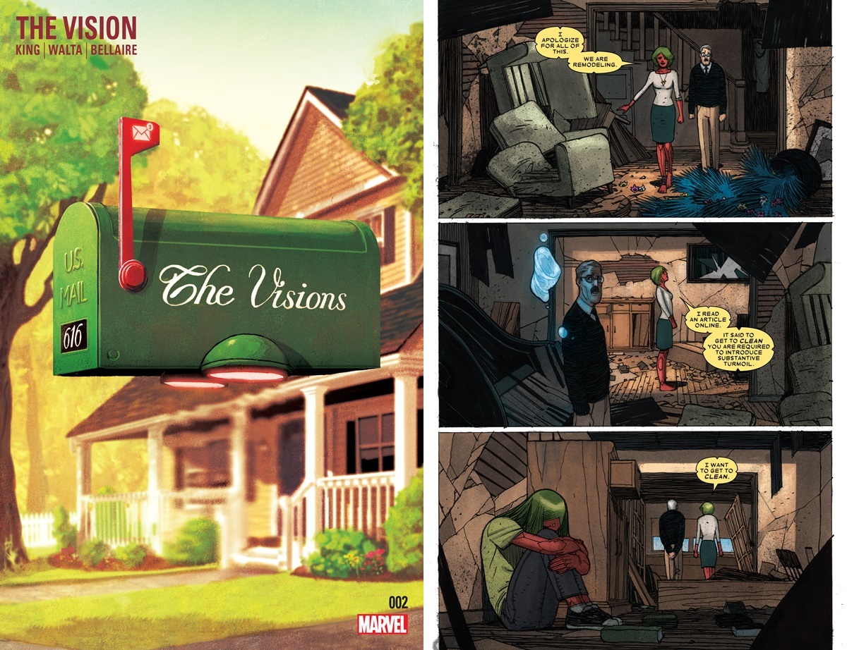 Az év szuperhősképregényes meglepetése Tom Kingtől, akinek a csillaga egyébként is felívelőben van a képregényiparban a Sheriff of Babylon című sorozatának köszönhetően: Vision szintezoid családot teremt magának, hogy hétköznapi életet élhessen, amikor éppen nem a Bosszúállókkal menti meg a világot. Könnyen megjósolható, hogy a három mesterséges intelligencia, Virginia, a felesége, Viv, a lánya és Vin, a fia átlag amerikai kertesházövezetbe telepítése nem fog jól végződni. Egy elsőként megtapasztalt erős érzelmi felindulásból elkövetett gyilkosság hazugságok és újabb végzetes döntések lavináját zúdítja el a családon belül, Vision pedig először kénytelen hazudni az eddig nagyon is tiszteletben tartott emberi törvényeket fenntartó hatóságoknak. Mi való előrébb: a család vagy a korábban szentnek és megingathatatlannak tartott elvek? Nagyon átgondolt, elképesztően jól megírt történet az emberi természetről, emberré válni akaró, gondolkozó robotokon keresztül. (NK)