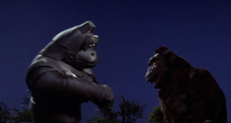 Amit Hollywoodban mostanság próbálnak tető alá hozni, azt Japánban már bő fél évszázada megcsinálták. A King Kong Vs. Godzilla mindkét híres karakter első színes mozifilmje – bár ennek a Kongnak csak nevében van köze az eredetihez: az inkább vígjátékként készített (és mindenképpen akként megtekintendő) műben kb. ötször nagyobb, nemhogy golyók, de bombák se nagyon hatják meg, a villám pedig feltölti elektromossággal, amelyet aztán az ujjaiból lövell ki (persze, mert az eredeti Kong már attól elpusztult volna, ha Godzilla csak ránéz). Ishiro Honda felelt az összecsapás levezényléséért (eredetileg stop-motion technikát akart alkalmazni, de végül költségvetési okok miatt a jó öreg „ember gumiruhában” módszerhez folyamodott), és a Kong vs. Godzilla jelenetek isten bizony a ’60-as évek legviccesebb bunyói közé tartoznak – Bud Spencer és Terrence Hill ehetik a kefét. Kirk és a Gorn? Közelében sincs. Az óriásgorilla egyébként rettenetesen gagyin fest, gesztusai nevetségesek, és úgy fut, mint egy karót nyelt úrinő, aki szarral a bugyijában menekül egy perverz elől. Guilty pleasure? Naná!