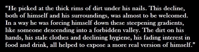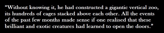 Az apokalipszis szó eredeti jelentésében tündököl: feltárulás, kinyilvánulás. Megmutatkozik legnagyobb közös osztónk, talapzatunk, valódi színünk. Sorban koppannak a maszkok: modern, hedonista értelmiségi, felvilágosodott ember, társas lény - valahol az első barlangrajzok környékén érdemes inkább szétnéznünk a családi fényképalbumban. A történtek után, történelem előtti időkben, mikor a portyázó életmódot folytató túlélők a többi épületet lesik az ablakból, a szomszédok elkerülhetetlen bukását várva, az olvasó végül elfogadja a levezetést, és megadja magát a humanista felfogás utolsó darabjait is feloldó fatalizmusnak.