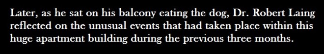 A High-Rise a Legyek Ura felnőtt és cinikus variánsa, ártatlan áldozatok és kívülről érkező megmentők nélkül, ahol a hatalmat jelképező (de nem biztosító!) státusztárgyak, státuszlakások és státuszdugások mitikussá nőttek, lekoptatva és messze maguk mögött hagyva holmi eredendő emberi érdekeket, sőt: vágyakat. De lehetne akár Az ember tragédiájának végleg kiábrándult, apokrif fejezete is.