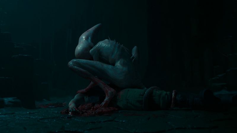 Azért legalább annyit elvártam volna Scott-tól, hogy ezt a vacak történetet jól rendezze meg. De bármilyen szépek is a képek, bármilyen jól néznek is ki a helyszínek (van egy egészen lélegzetelállító set piece), egyetlen szál tényleg izgalmas, tomboló iramú, kényelmetlen jelenetet leszámítva (az első fertőzések/támadások szimultán bekövetkezte) csak kapkodó kaotikusság vagy érdektelen, beszélő fejeken elidéző stagnálás van. Emlékeztek a klasszikus Alienek iszonyú hangulatos, beszaratós feszültségteremtésére? Az akció, a horror fokozatos, idegőrlő felvezetésére? A sötétben, nyálkás falak, villódzó fények, szűk járatok közti, magányos rettegésre? Na, itt nincs semmi ilyesmi. Onnantól, hogy belép a történetbe a xenomorf, az lesz a menetrend, hogy hirtelen felbukkan valahol, pár másodperc alatt megöl valakit, aztán már vágunk is a következő jelenetre (pénzügyi szempontból persze érthető: a mai plázaközönség már nem a ’70-es, ’80-as évek filmjeinek tempójára van kondicionálva, már nem lehet felvezetésre „vesztegetni” az időt, a dolgok csak úgy pikk-pakk megtörténnek). A zuhanyzós szex közbeni támadás egyenesen Jason X-kategória.