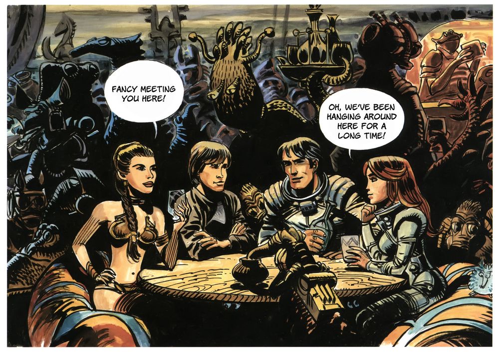 És ha Lucas valóban a Valerian és Laureline-ből nyúlt, miért nem beszél róla? Egyetlen más inspirációját sem szégyellte soha, számtalan interjúban lelkendezett a Flash Gordontól Kurosawa szamurájfilmjein át a The Dam Bustersig mindenről, amiből legendás űroperáját összeollózta. Az is beszédes, hogy a Star Wars-Valerian és Laureline hasonlóság jellemzően csak utóbbi kapcsán szokott felmerülni, és alapvetően annak alkotóitól származik – Mézières még egy ilyen rajzot is készített annak idején egy cikkhez, afféle Lucasnak szánt fricskaként: