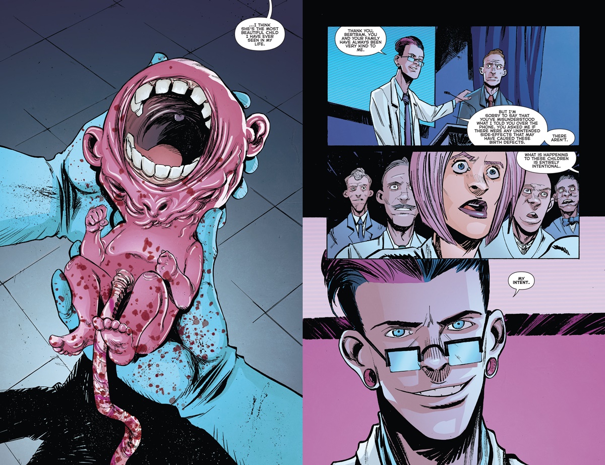 Ha egy pár bármely tagja részesült a vakcinából, az úgy írta át a génállományát, hogy a születő gyereke teljesen véletlenszerű arctorzulásukkal jön a világra, bőre mályvaszínű, ám ezen túlmenően teljesen egészséges. A genetikus, Doktor Cyrus Crane büszkén számol be kollégáinak arról, hogy ez teljesen tudatos döntés eredménye: így próbálja elejét venni a másság miatti gyűlölködésnek. Pár generáción belül minden születő gyermek hasonló torzulásokkal jön világra, s előbb-utóbb ez lesz a norma: nincs két hasonló arc, következésképp mindenki egyenlő. Ám többről van szó ennél. Ígérete szerint az érintett újszülöttek az átlagembernél jobb fizikai és mentális képességű felnőttekké cseperednek majd, kiküszöbölt minden öröklődő betegséget és betegségre való hajlamot, illetve bárki is nemz gyereket az új generáció tagjaival, gyermekük tovább örökli a fent vázolt tulajdonságokat. Vérgőzős befejezéssel véget is ér az első szám, az utolsó oldal pedig azt ígéri, hogy a következő a 200 évvel későbbi állapotokat mutatja majd be.