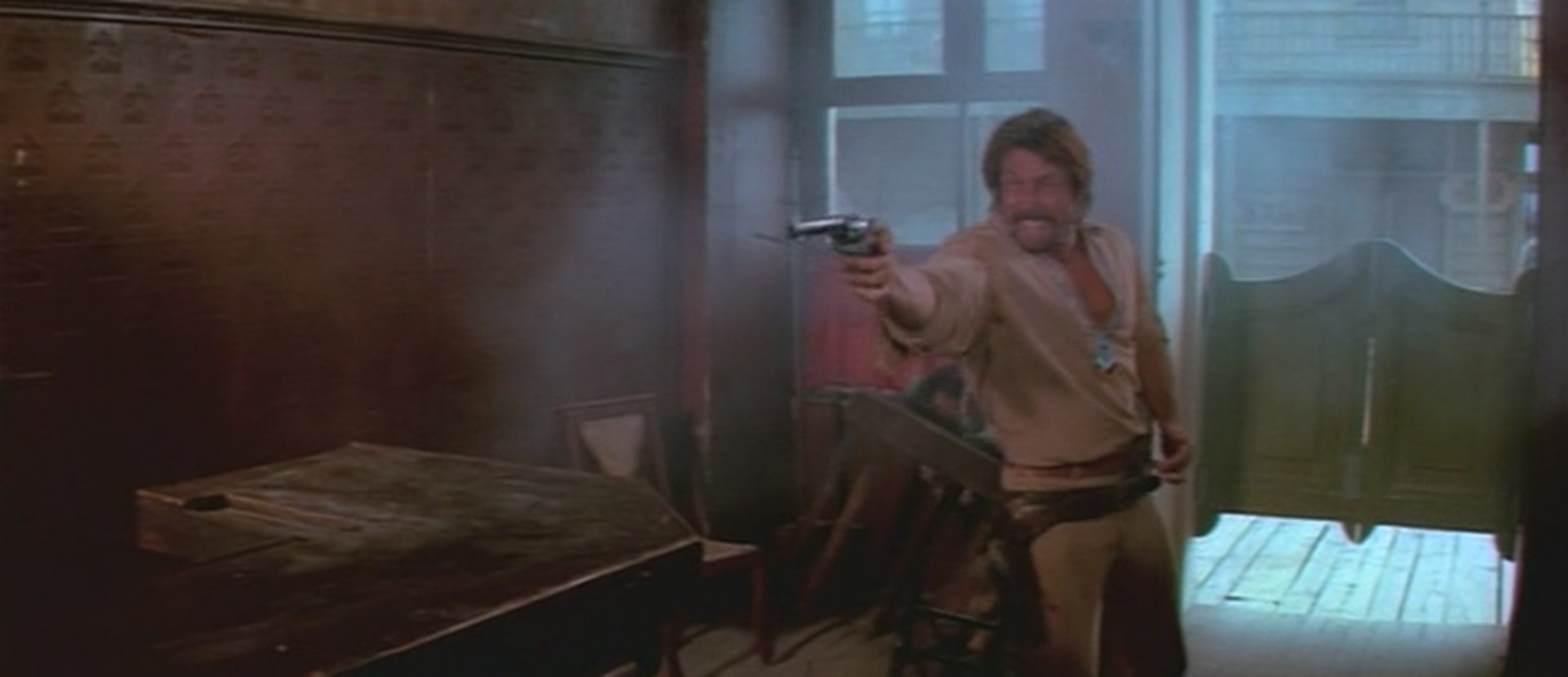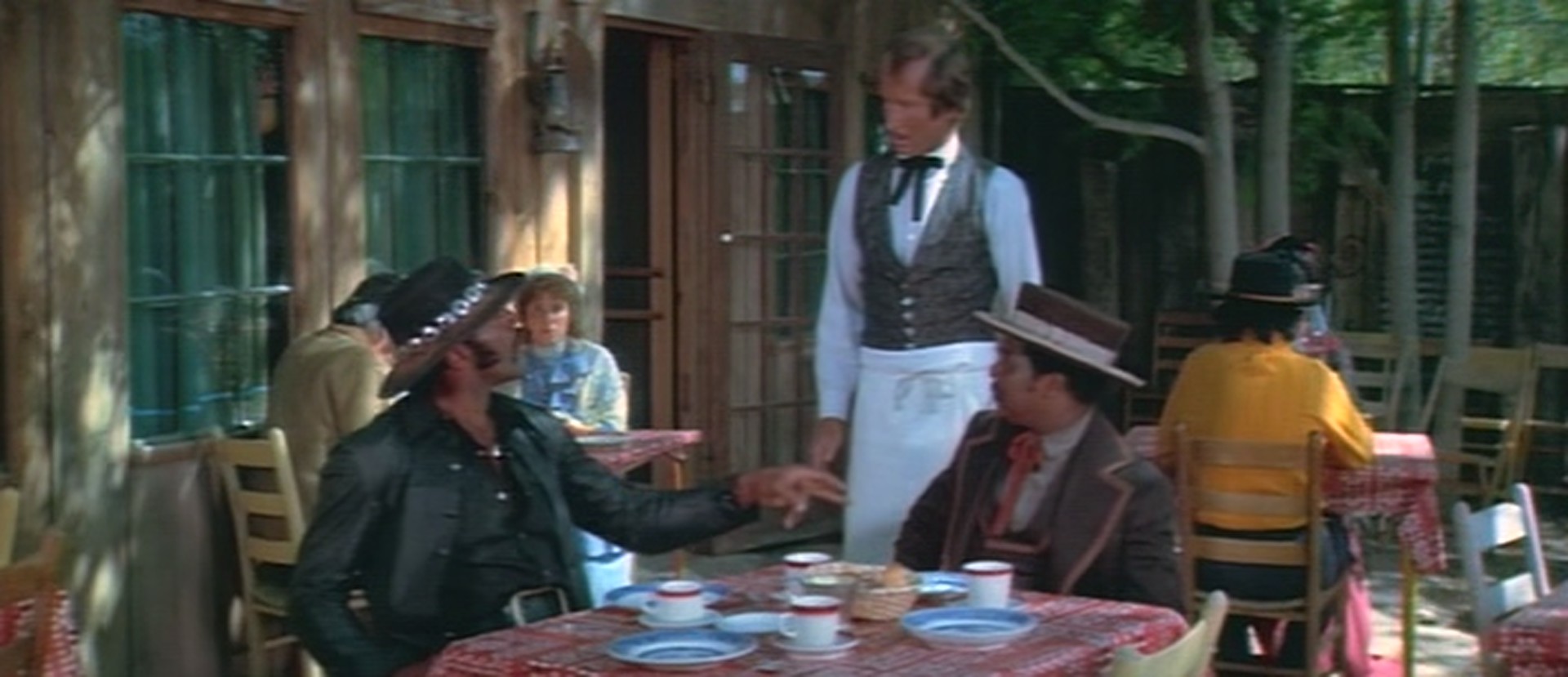 Boss és társa, Amos leülnek a poros vadnyugati koszfészek éttermébe, és amikor a tulaj észreveszi, hogy két fekete vendége van, köpni-nyelni nem tud, csak hitetlenkedve bámulja őket. Boss, akinek addigra már pont tele van vele a töke, hogy a város úgy néz rájuk, mint valami bizarr és illetlen vándorcirkuszra (lásd még: Django elszabadul, „Is that a nigger on a horse?”), kifakad, és a barátjára mutat: „Figyelj, tudja ő, hogy nigger. Én is tudom, hogy nigger vagyok, úgyhogy teljesen felesleges közölnöd velünk, hogy niggerek vagyunk. Viszont még a niggereknek is kell enniük, úgyhogy hozz nekünk valami kaját gyorsan, vagy szétdurrantom a fejedet.” Nem sokkal később Amos egy rabszolgatartó déli úr flancos beszédstílusát és akcentusát tökéletesen mímelve közli a polgármesterrel, hogy szíveskedjen visszajönni később, mert étkezés közben nem tárgyalnak senkivel.