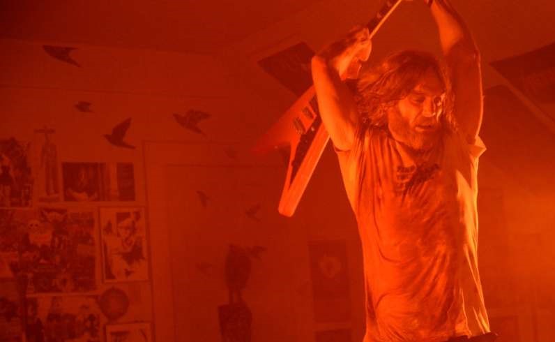 Nyilván nemcsak azért rühellné Corrado Balducci, a Sátánizmus és rockzene című legendásan bigott könyv szerzője a The Devil’s Candyt, mert a filmbeli gyilkos egy fiktív katolikus tévécsatorna műsorait hallgatja ölés közben háttérzaj gyanánt. Byrne metálrajongása az egész filmen érződik, és remekül át tudta ültetni a film nyelvére azt az impulzivitást és dühöt, amely a műfaj sajátja, dübörögjön akár a Pantera, a Slayer, a Metallica vagy a Machine Head, hogy csak a soundtrack legismertebb neveit említsem. Kép és zene együtt lélegzik, ez még akkor is így van, ha Michael Yezerski nyomasztó atmoszférikus score-ja szól. Erre a szimbiózisra gyönyörű példa az a montázs, amelyben a festményén dolgozó Jessie-t és a gyilkosság nyomait feltakarító Rayt láthatjuk: az egyre zaklatottabb zenével együtt a közelik is egyre rövidebbek, és a festék vörösét már meg se tudjuk különböztetni a vér színétől. Vagy ott van a finálé egy tűzpiros Flying V gitárral, valamint a Pokol lángcsóváival a főszerepben. A legnagyobb telitalálat azonban a SunnO))) rituális drone metaljának és Csihar túlvilági kántálásának a cselekmény szövetébe való átültetése. Egy kezemen meg tudnám számolni, hányszor nyúltak ennyire kreatívan a filmtörténet során a fémzenéhez, és nemcsak hangulatfokozóként vagy szimpla pózerségből használták. Az utóbbi időkben még a Hesher és az izlandi Malmhaus képviselt hasonló elköteleződést a metal iránt. Hip-hop és EDM által terhelt századunkban ez a hozzáállás több mint tiszteletreméltó.