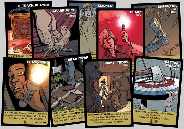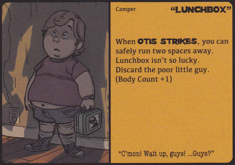 Alapvetően ötféle típusú kártya kerülhet a kezünkbe: tárgy (Weapon és Item), táborozó kisgyerek (Camper), mellékszereplő (Cameo), váratlan fordulat (Plot Twist) és az Otis támadásaira vonatkozó kártyák (Otis Strikes és Otis Rumor). Az Otis Strikes húzása azt jelenti, hogy az addig a táblán jól láthatóan máshol ólálkodó sorozatgyilkos hirtelen előlép a sötétből, és lesújt a játékos karakterére. Ha valakinek van fegyvere, egy nagyon egyszerű ellendobással (a játék négy-, hat-, nyolc-, és tízoldalú kockákat használ) nagyobbat kell dobnia, mint Otis. Ha sikerül, meghátrálásra késztette a támadóját (megölni természetesen csak a fináléban lehet), ha nem, akkor a medvemaszkos gyilkos megsebezte, és a karakterlapján szereplő Panic értéknek megfelelő távolságra menekülhet. Ha az összes játékos lépett, Otis jön, és az éppen aktuális értékeinek megfelelően mozog a táblán, megpróbálva becserkészni leendő áldozatait.