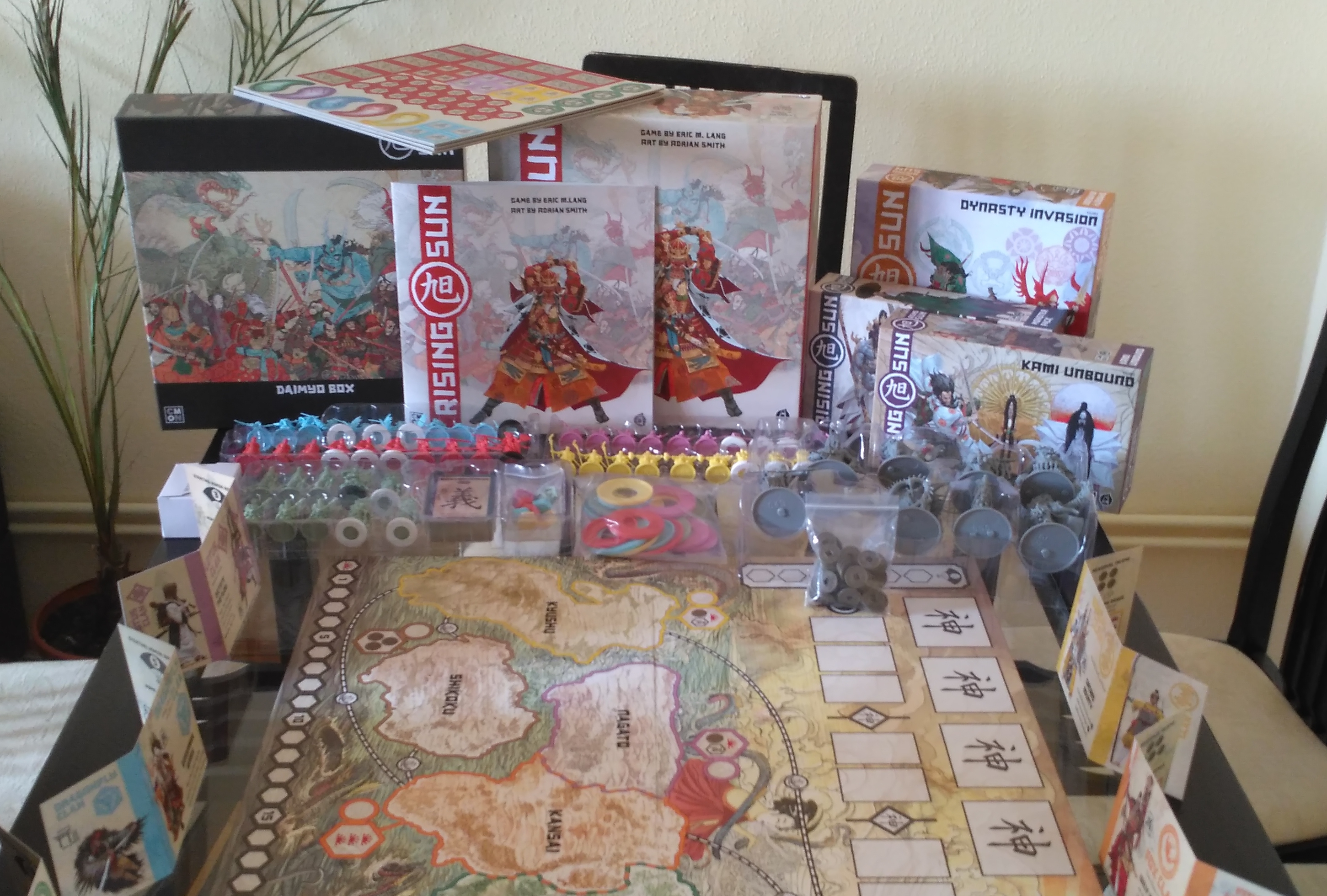 A Felkelő Nap az utóbbi évek egyik legnagyobb port kavart társasjátéka. A 2017-ben Kickstarteren elindított Rising Sun (a Cool Mini Or Not kiadó ugyanis előszeretettel futtatja meg játékait egy alapos kalapozás keretében, lelkiismeret-furdalás nélkül használva fel a közösségi finanszírozás nem éppen erre kitalált platformját) több, mint négymillió dollárt gyűjtött össze kampánya során, amivel bekerült a rekordot döntő társasok panteonjába. Ahogy a CMON-tól az várható volt, vérprofi kampányt toltak a játék alá, bődületes támogatási szintekkel és annyi extrával, hogy azok csak több dobozban fértek el.