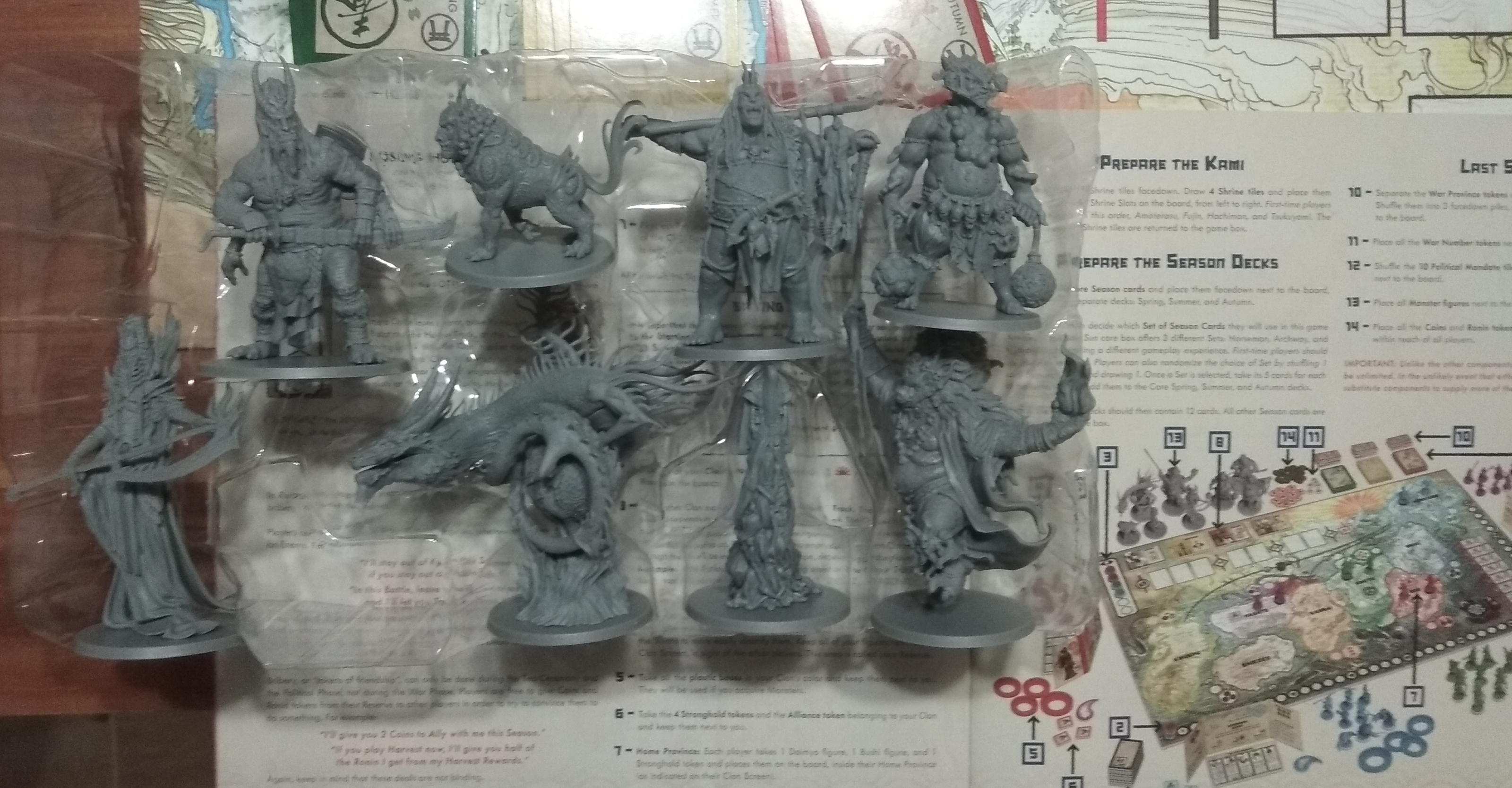 Annak, aki ismeri a CMON játékait, a külcsínt különösebben nem kell részletezni, az Adrian Smith elképesztő grafikái alapján készült minik gyönyörűek, pláne, ha egy ügyes kezű figurafestő pingálja ki őket. A Kickstarter verzióban a bolti változat kartonjelölőit látványos műanyag tartozékokra cserélték, és ez nem csak szemfényvesztés, mert a játékélményt alaposan megdobja: más érzés a madzsong köveihez hasonlító parancsokat fogdosni, vagy a szövetségjelölő jókora, kavicsszerű cseppecskéjét összeilleszteni egy másikkal, de a funkcionalitásban is van szerepük, mert a lapos számlapkák helyetti zászlókon jobban látszanak a számok, az erődök pedig nagy, látványos kastélyok (a Teknős kláné konkrétan egy bazinagy teknősön van).