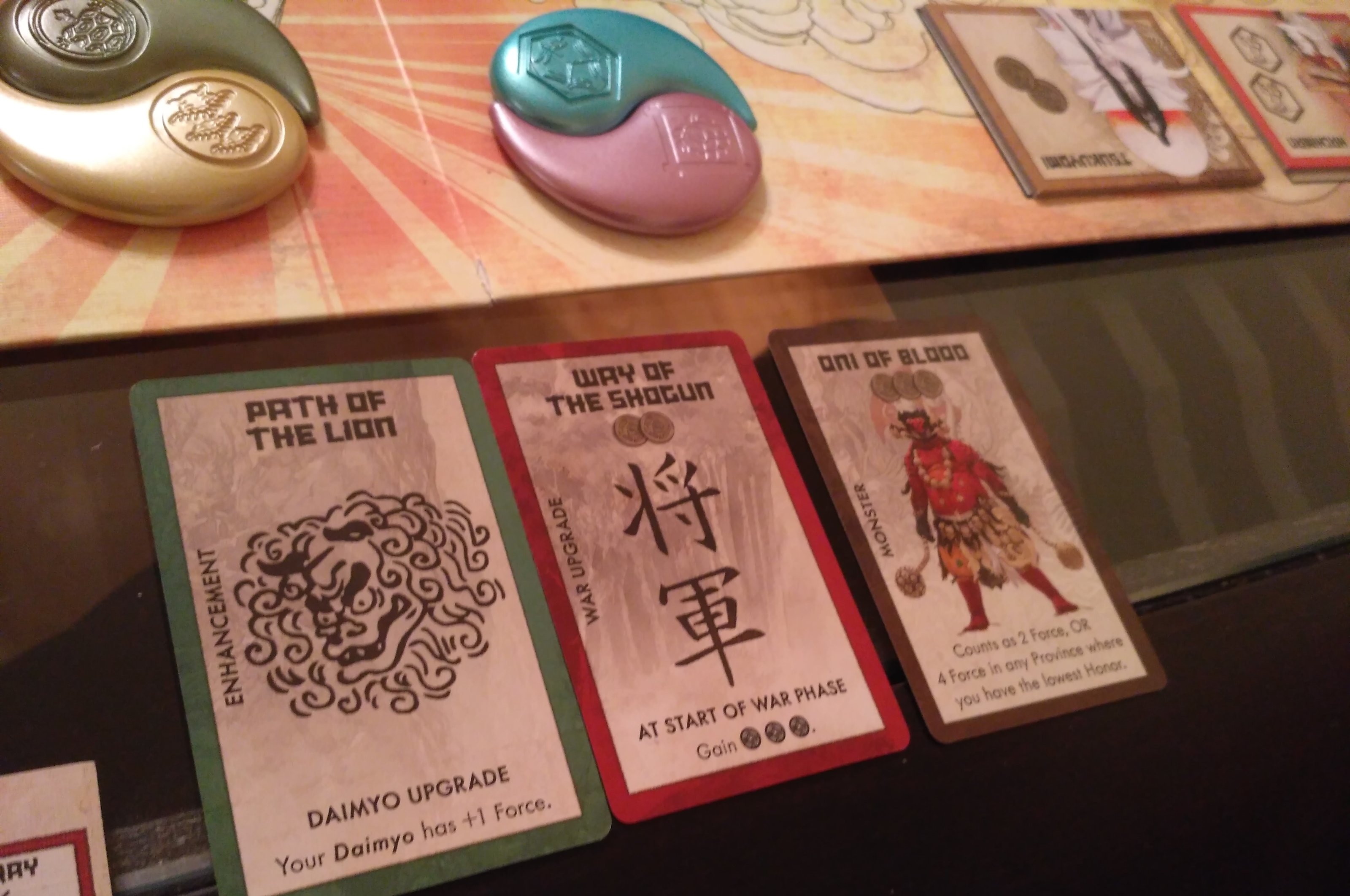 Ami nem is olyan könnyű, lévén a Felkelő Napban többféle út vezet a győzelemig. Az első és legszembetűnőbb a háború, azonban pusztán erre támaszkodni rizikós, muszáj kiegészíteni csaták közben elkövetett szeppukukkal, császári költőkkel, esetleg győzelmi pontot adó betakarításokkal, azonban a legtöbb ilyen “mellékes” pontot a megvásárolható kártyákkal szerezhetünk. Van olyan, amelyik a csatákban meghalt figurák után ad pontot, van, amelyik az erődítmények, esetleg a szövetségek száma után, de létezik olyan szörny, amely pontot lop és így tovább. A kártyák változatosságot csempésznek a játékba, segítségükkel pedig több fronton is megvethetjük a lábunkat pontszerzés terén.