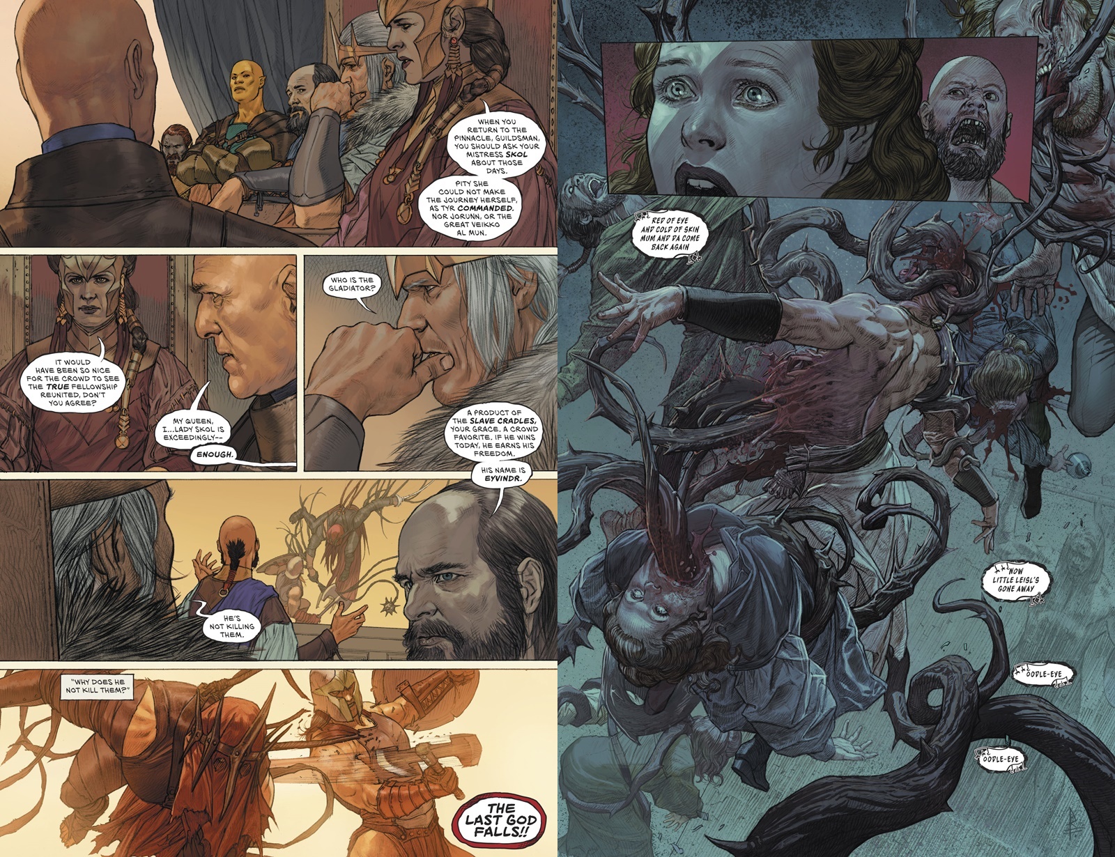 A DC Black Labelének egy újabb jó választása, ezúttal is a szuperhősöktől távol, de még a horror határmezsgyéjén belül. A The Last God az olyan klasszikus eposzi fantasyk nyomán indul el, mint A gyűrűk ura vagy Az idő kereke, ám nem spórol a vérgőzös és horrorisztikus elemekkel. Cain Anuun világát egykor az Ürességben Lakozó Isten fenyegette, a teremtés egészének elpusztítására törve, ám egy csapatnyi hősnek sikerült megállítania. Ezek a hősök ma királyságok és birodalmak urai és úrnői, ám harminc évvel később a rontás szirmai újra kivirágzanak az általuk megfertőzött emberekben: félig tövisnövény, félig élőhalott lények özönlik el Tyrgolad fővárosát, megállíthatatlanul duzzasztva soraikat az áldozataik számával. Tyr, az egykori istenölő az eddig benne lapuló mag hatására az új invázió vezetőjévé, Mol Uhltep megtestesülésévé válik, így a helyzet a múlt régi és a jelen új hősei után kiált. Tyr felesége, Cyanthe királynő, Eyvindr, a felszabadított gladiátor rabszolga és Veikko, az aelvák Lélekrévész királynője elindulnak, hogy felkutassák egykori bajtársaikat, és újra megmásszák a Fekete Lépcsőket. A történet, amolyan True Detective-módra egyszerre két idősíkot követ, az egyik a Mol Uhltep első vereségéhez vezető utat meséli újra, míg a másik az erre rímelő, de jelenben zajló eseményekre koncentrál. A legendák persze nem azt énekelték meg, ami valójában történt annak idején, és az igazság lehet a kulcsa az istenkirály újbóli legyőzésének is.