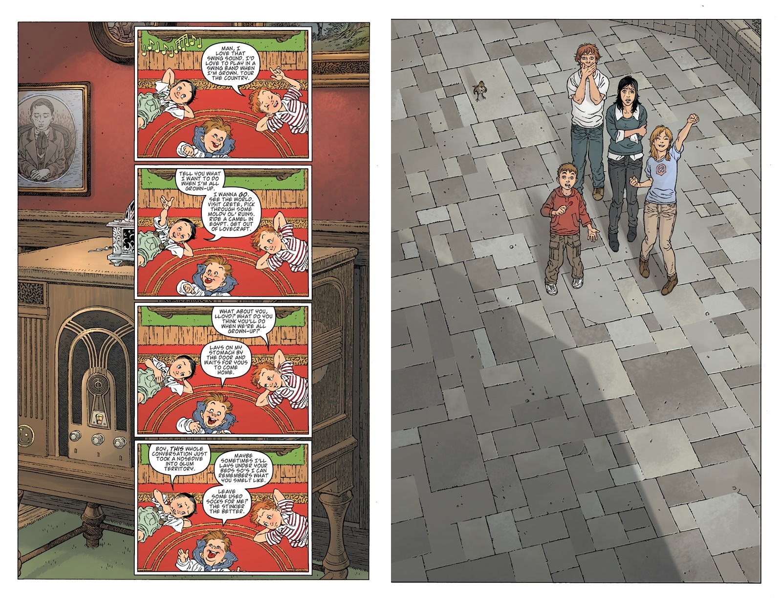 A második rövid történet már az új kezdetekbe ad bepillantást: a szinte dialógus nélküli sztori a Keyhouse pusztulása után annak újjáépítését meséli el a jól ismert és megszeretett szereplőkkel. Katartikus élmény, de persze csak azoknak, akik már elolvasták a Locke & Key hat kötetét (Akik pedig még nem, azonnal pótolják - az angol nyelv nem ismerete sem lehet kifogás, a Fumax már az egészet kiadta magyarul). Ebben a füzetben az is teljesen nyilvánvaló lesz (ha esetleg eddig nem tűnt fel valakinek), hogy Rodriguez stílusa mennyit fejlődött a sorozat első füzete óta: szemet gyönyörködtető, ég és föld a különbség.
