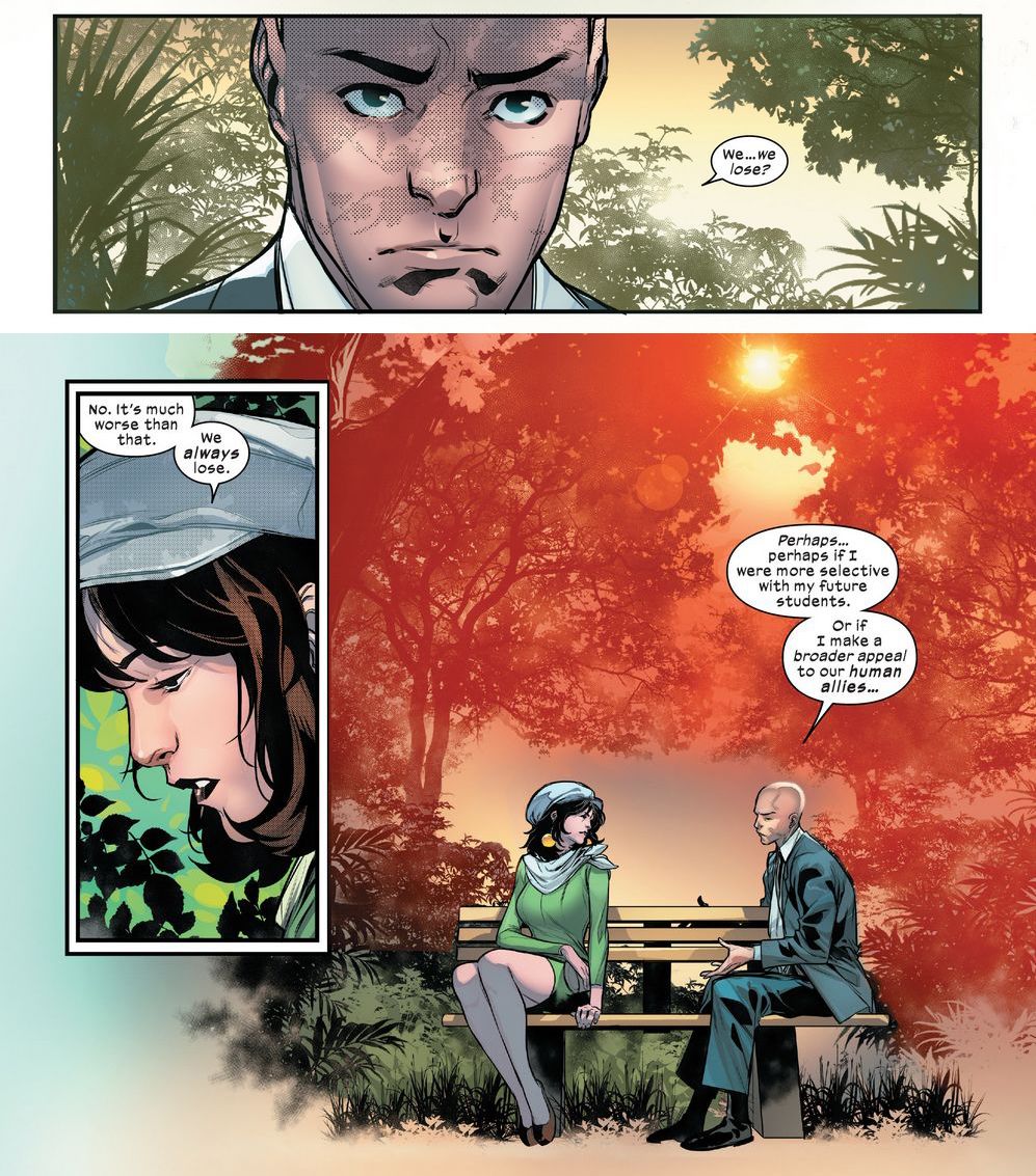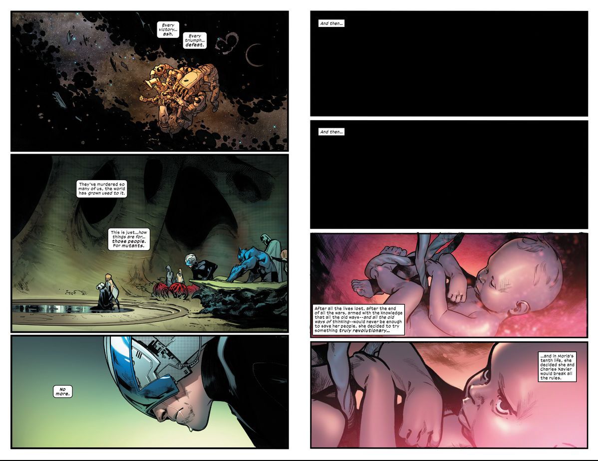 Minden Moira halálból való visszahozására és központi alakká emelésére épül (a sorozatnak ezt a rafinált és túlzás nélkül zseniális, idővel és térrel kavaró aspektusát nem véletlenül nem lövöm le, annak ellenére, hogy már az első néhány számban kifejtik). A történet folyamatosan vált a múlt, a jelen, a távoli és a még távolabbi jövő szálai között, ahogy feltárul előttünk a mutánsok ügyének ezernyi lehetősége, veszélye, ellentmondása, megmásíthatatlansága és bonyodalma. Hickman (ahogy az Avengers/New Avengers-sztorijában is) túllép a pofán verhető nemezis koncepcióján. Xaviernek, Magnetónak és társaiknak természetesen sok hagyományos értelemben vett ellenséggel is szembe kell nézniük (többek között egy mutánsellenes szervezettel, mely olyan igazságszolgáltatási és terroristacsoportok maradékaiból áll össze, mint a S.H.I.E.L.D. vagy a Hydra), ám a HoX/PoX új status quójának egyik legmarkánsabb eleme annak felismerése, hogy néhány gonosztevő/zsarnok/terrorista leverése még bőven nem hozza meg a kívánt eredményt. Ezek ugyanis nem magányos, kontextus nélküli ügynökök: megváltoztathatatlan társadalmi, politikai és evolúciós folyamatok állnak mögöttük, amelyeket nem lehet felpofozni és börtönbe zárni.