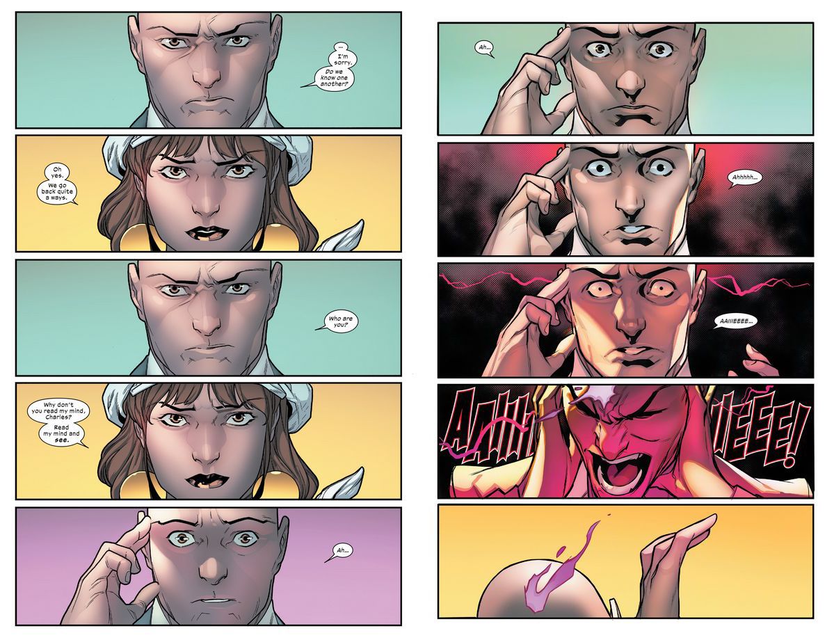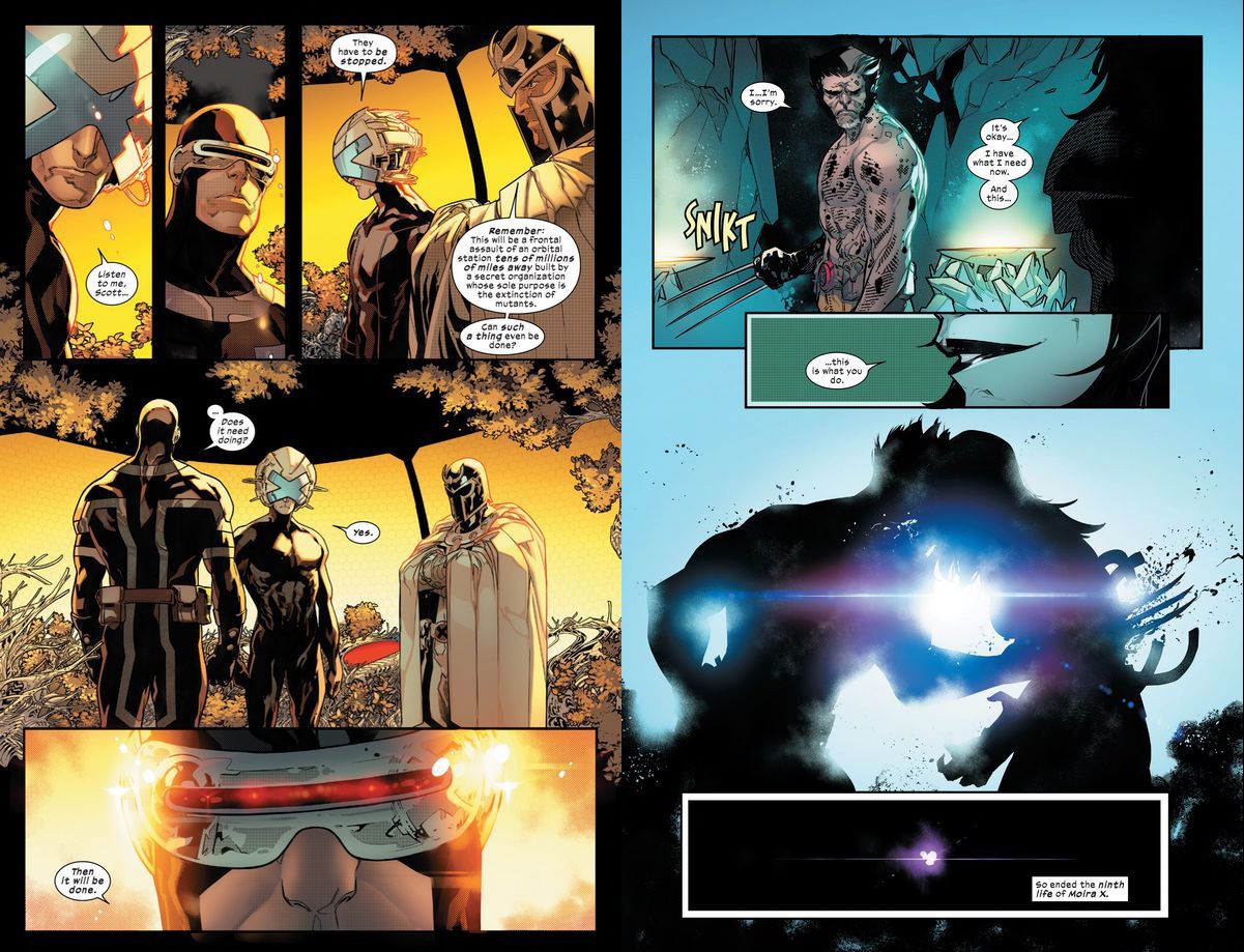 A HoX/PoX újításai azonban nem csupán karakterszintűek – alapjaiban rengetik meg az egész mutánsuniverzumot. Ami azt illeti, a szereplők érzései, motivációi, gondolatai (érthető módon) kissé el is sikkadnak a teljesebb, grandiózus kép felvázolása mellett (a HoX/PoX-ból kinövő sorozatokban bőven kínálkozik majd alkalom a karakterszintű vizsgálódásra). Egy nagyon fontos és hangsúlyos kivétel van: Moira MacTaggert, Xavier egykori szerelme és segítője, egy egyszerű ember, aki az X-Men kontinuitásában egy 2001-es történet óta halott. Vagyis Hickman a retconok területére téved, ami mindig veszélyes és majdnem mindig olcsó húzás – a legtöbben ilyenkor vödörnyi festéket loccsantanak fel elődeik vásznára, nem számít semmi, csak a saját otromba elképzelésük. Hickman azonban óvatos ecsetvonásokkal igazítja ki a már létező X-tablót: megtart mindent, nem rondít el semmit, „csak” felvázol a már létező festmény hátterébe egy monumentális koncepciót, és elegánsan elhiteti velünk, hogy ez így van, így helyes, így logikus, és mindig is így volt.
