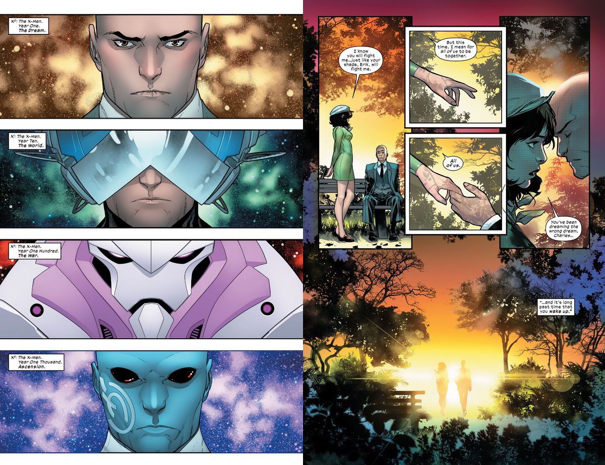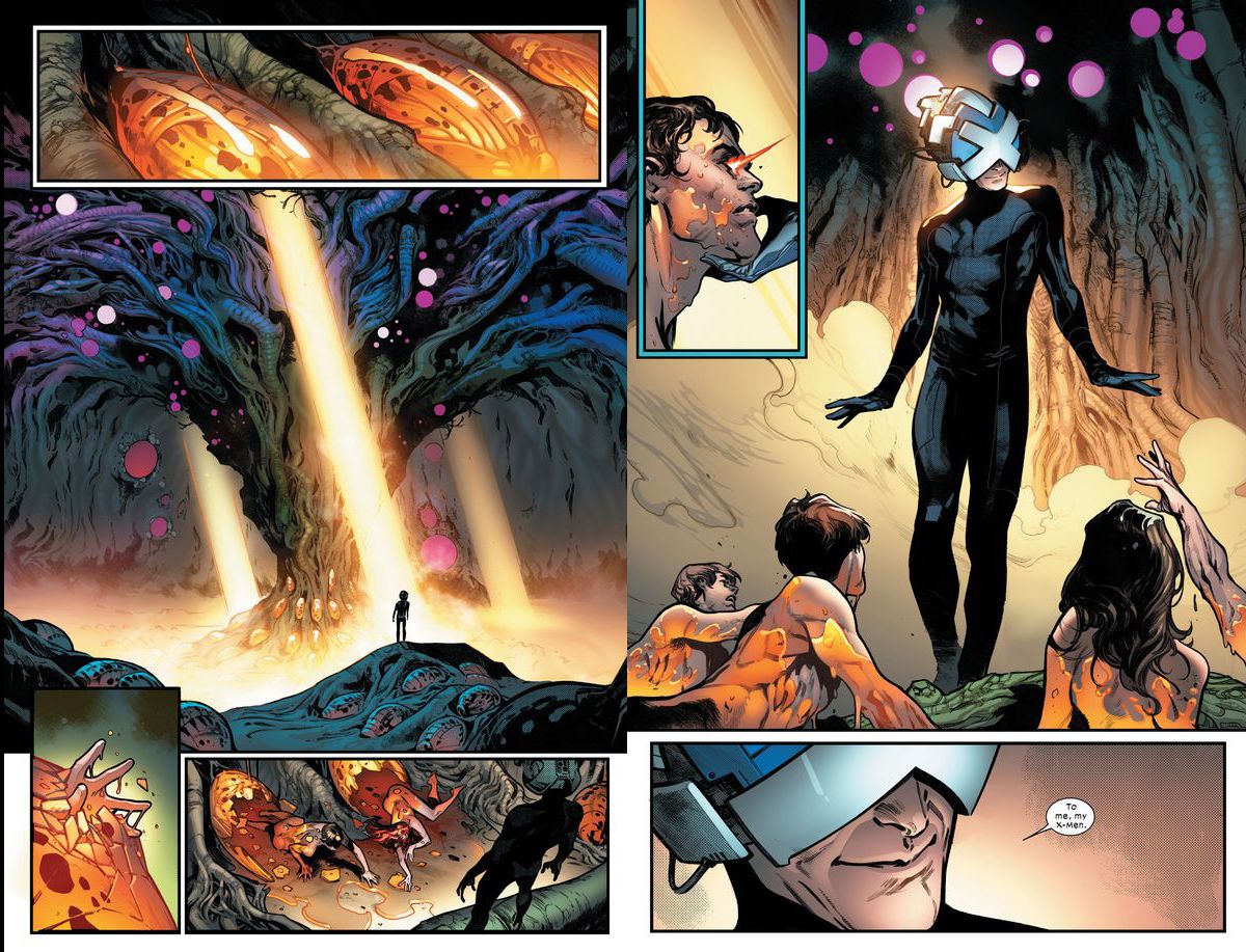 Hickman a modern science fiction nagy kérdéseit és témáit fűzi bele az X-univerzum szövetébe, és hogy ezt milyen radikális, bizarr, mindfuck-szerű, mégis mindig logikusnak érződő ötletek kavalkádjával teszi, arra remek példa a nyitójelenet: a Cerebro-sisakot viselő Xavier mosolyogva hívja magához az X-Men tagjait (a klasszikus szavakkal: „To me, my X-Men!), akik fagyökerekből kinövő természetes tojás-inkubátorokból, felnőttnek születve, magzatvízben ázva másznak elő. E szekvencia egyébként csak pár száz oldallal később, egy lélegzetelállítóan megkomponált űrbeli akciójelenet után nyer értelmet: Hickman gondosan megtervezett történetfolyamában minden elejtett szónak, minden háttérben felvillanó képtöredéknek, minden visszatartott információmorzsának jelentősége van. A rengeteg, már önmagában is invenciózus részletből a végére áll össze a nagy, gyönyörű, katartikus, minden túlzás nélkül forradalmi egész.