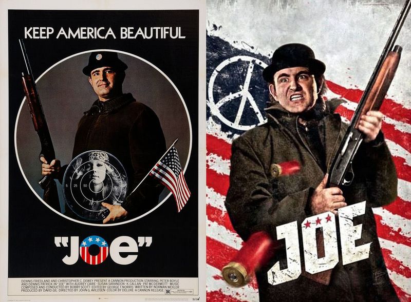 A Joe (1970, r.: John G. Avildsen) melós címszereplője és az ő újdonsült felső-középosztálybeli barátja, Bill közti kibékíthetetlennek tűnő osztálykülönbségeket elolvasztja a hippik iránti közös gyűlöletük. A két középkorú férfi megvetéssel tekint a szabad szerelem és a drog mámorában élő elkényeztetett tinédzserekre (köztük Bill lányára, akit az első szerepében felbukkanó Susan Sarandon alakít), Joe hosszasan és szívesen fröcsög egy ital mellett a feketékre, a melegekre, a csavargókra, a liberálisokra (a film posztere, rajta az egyik kezében puskát, a másikban amerikai zászlót mosolyogva tartó Peter Boyle-lal, fölötte a „Keep America Beautiful” szlogennel akár a Trump-kampány emblémája is lehetne). A mára nagyjából elfeledett, de akkoriban szép sikert arató, forgatókönyvéért Oscar-jelölést is begyűjtő Joe két főszereplőjének modern világgal szembeni frusztrációja (és a frusztráló világból való kirekesztettsége – mert azért a szabad szerelembe, a friss tinihúsba csak belekóstolnak ők is, de tudják, ez egyszeri alkalom, a virágparadicsom zárva marad előttük) természetesen erőszakhoz vezet. Csak ürügy kell hozzá – meg is kapják. Ahogy a főcímdal zengi: „Hey Joe, don't it make you want to go to war… once more?”