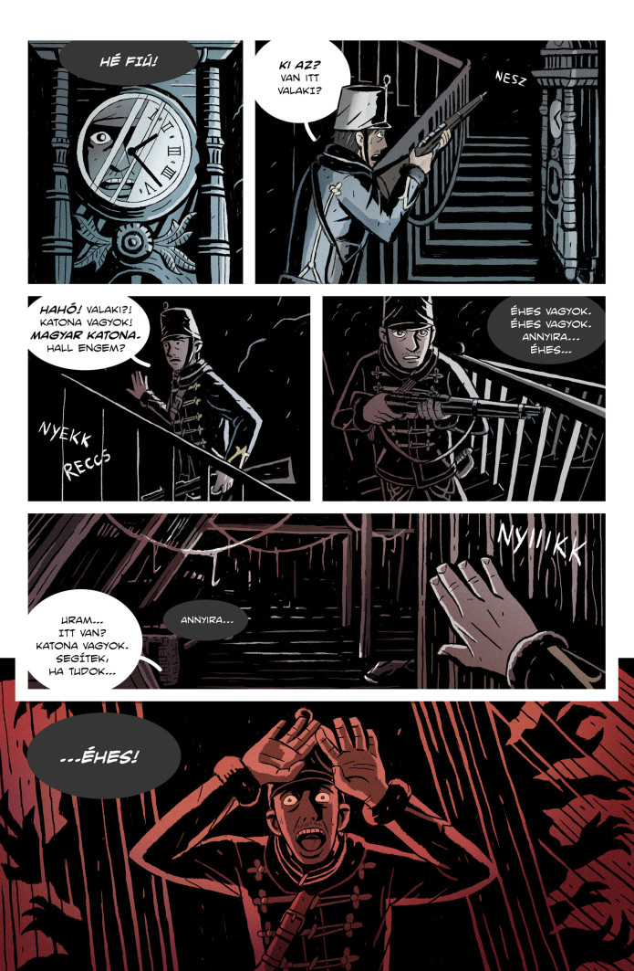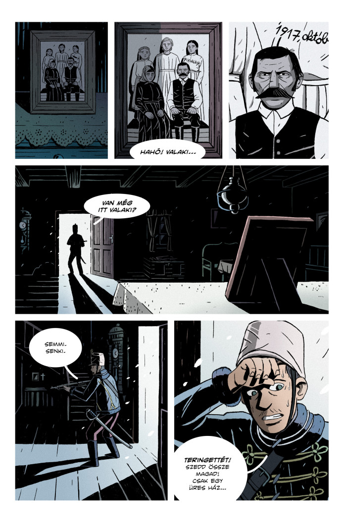 A világháborúval párhuzamosan vívott természetfeletti elleni küzdelem egy Temesvár közeli kis faluba veti a Monarchia különleges alakulatát, akiknek a helyiek és egy komplett huszárszázad eltűnésének rejtélyét kell megoldaniuk. Az alkotók rengeteg szálat feldobnak, és egy pillanatra fellebbentik a fátylat a szereplők személyes, sötét titkairól, amíg a huszárok helyreteszik az olvasó számára ismerős-ismeretlen szörnyeteget, és talán ez az egyetlen aprócska hibája a történetszövésnek: a képregény ambíciójához képest kissé szűkös oldalszámban nem kapunk túl sok választ. Elképesztő potenciál rejlik ebben a témában és a teljes vállalkozásban, de ilyen tempóban nagyon lassan fognak kibomlani és összeállni azok a történetszálak. Nyilvánvalóan roppant munka ez két embernek (valójában többnek, hiszen például a színezésben is volt segítségük), akik ráadásul (pontosabban a hazai viszonyok között: természetesen) ezt nem főállásban készítik, de ezt ők is hamar belátták, és már az alternatív borítóknál bevonták a projektbe a hazai képregényrajzolók színe-javát. A hírek szerint két rövidebb sztorit Németh Gyula és László Márk fognak rajzolni, ami nagyszerű hír, hiszen mindketten már külföldön is befutott és elismert grafikusok.