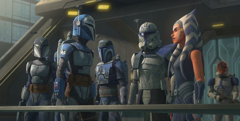 A széria eljátszott Lucas trilógiájának néhány parlagon heverő koncepciójával, és kiköszörülte a felvezető mozifilm legocsmányabb csorbáit, így például ágyútöltelékekből jellemmel és lelkivilággal felruházott katonákká léptette elő a klónokat, a kezdetben elviselhetetlenül irritáló, bugris Ahsokából pedig komplex, megfontolt karaktert faragott, aki tiszta szívvel olvassa rá a jedik fejére azok dogmatikus és képmutató baromságait. A klónok háborúja, ha teljes egészében nem is, részleteiben mindenképpen érdekes és izgalmas show-vá nőtte ki magát – de épp ez a probléma: hogy csak részleteiben. Senkinek nem merném jó lelkiismerettel ajánlani, hogy álljon csak neki bátran a 133 epizódnak, remekül fog szórakozni. Ahhoz túúúlságosan sok a (legfeljebb!) közepes darab, úgy kell kiválogatni közülük a megtekintésre tényleg érdemes történetszálakat. Mint például az ötödik évad négyrészes fináléját, melynek során elmosódnak a határvonalak az egyértelműen jó és rossz között, Ahsoka pedig kiábrándul a Jedi Rendből (erről annak idején itt áradoztam). Vagy mint a több évadon átívelő, és a már említett sorozatfinálét is meghatározó mandalori szálat.