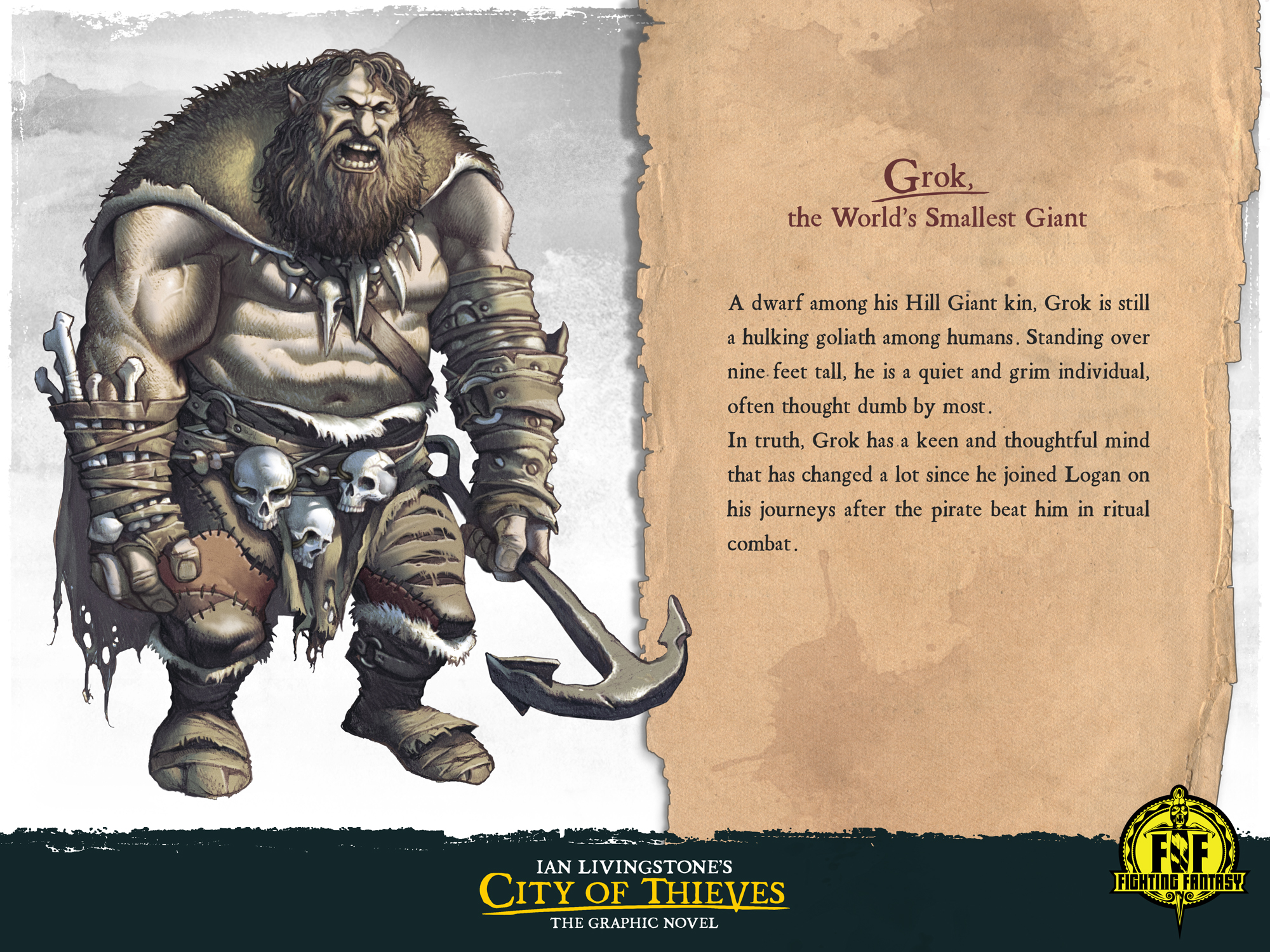 Livingstone már az elején leírta, hogy egy teljesen új spin-off-történetet szeretne látni a játékkönyvből ismerős elemekkel - de a főszereplő ezúttal ne egy tipikus hős legyen, hanem egy tolvaj, és az ő szemszögéből mutassuk be a kalózoktól, rablóktól és sarlatánoktól nyüzsgő Feketehomok kikötő napfényes piactereit és sötét sikátorait, ahol Azzur nagyúr szava és a Troll gárdisták ökle a törvény. Ez volt tehát a háttértörténet, amelyhez Mácsai Gergő cimborámmal egy saját sztorit kanyarítottunk, folyamatosan, minden ötletünket egyeztetve Livingstone-nal, aki hatalmas lelkesedéssel nevezi át a karaktereket, talál ki új szereplőket, vagy épp rajzoltatja át a főhős fizimiskáját.