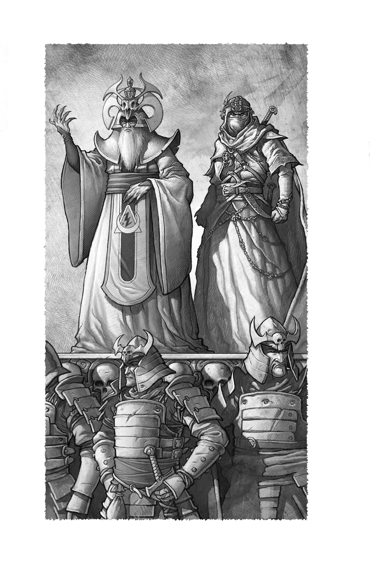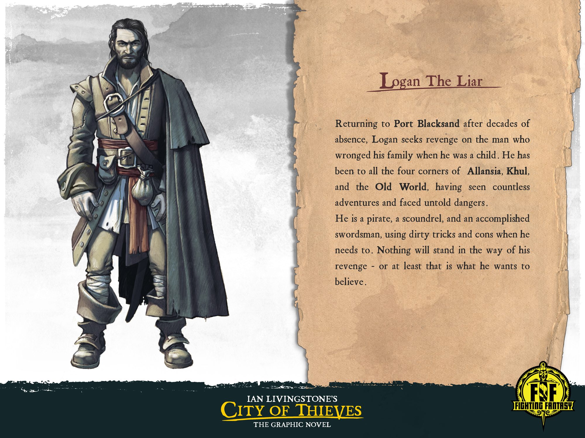 A képregényterv Krisztián concept artjaival és borítótervével rögtön zöld utat kapott Livingstone-tól. A sztori egy bosszútörténet Fighting Fantasy-elemekkel: Logan, a sok évnyi kalandozás után Feketehomok kikötőjébe visszatérő kalóz, Mariola, a vad elf sámánlány, Grok, Titán világának legkisebb óriása, Griff, az eszelős törpe puskaműves és Santiago, a cirkuszi erőművészként dolgozó tengeri haramia leszámolni készül a város gonosz kalmárfejedelmével, aki annak idején kisemmizte és lemészárolta Logan családját. Részletesen összeírtuk Gergő cimborámmal, melyik oldalon honnan indul a cselekmény, és hová kell eljutnia, a prológustól kezdve egészen a grandiózus fináléig. Minden egyes karakter képregénybeli kinézetét, legyen szó az általunk kitalált antihősről vagy egy olyan játékkönyvbeli szereplőről, mint Kövérorr vagy az ágyúgolyós izompacsirta, le kell egyeztetnünk Livingstone-nal – legutóbb épp az irigység gonosz istennőjét követő Tanit-papnő ruháját hagyta jóvá, amihez Krisztián elég sok verziót megrajzolt.