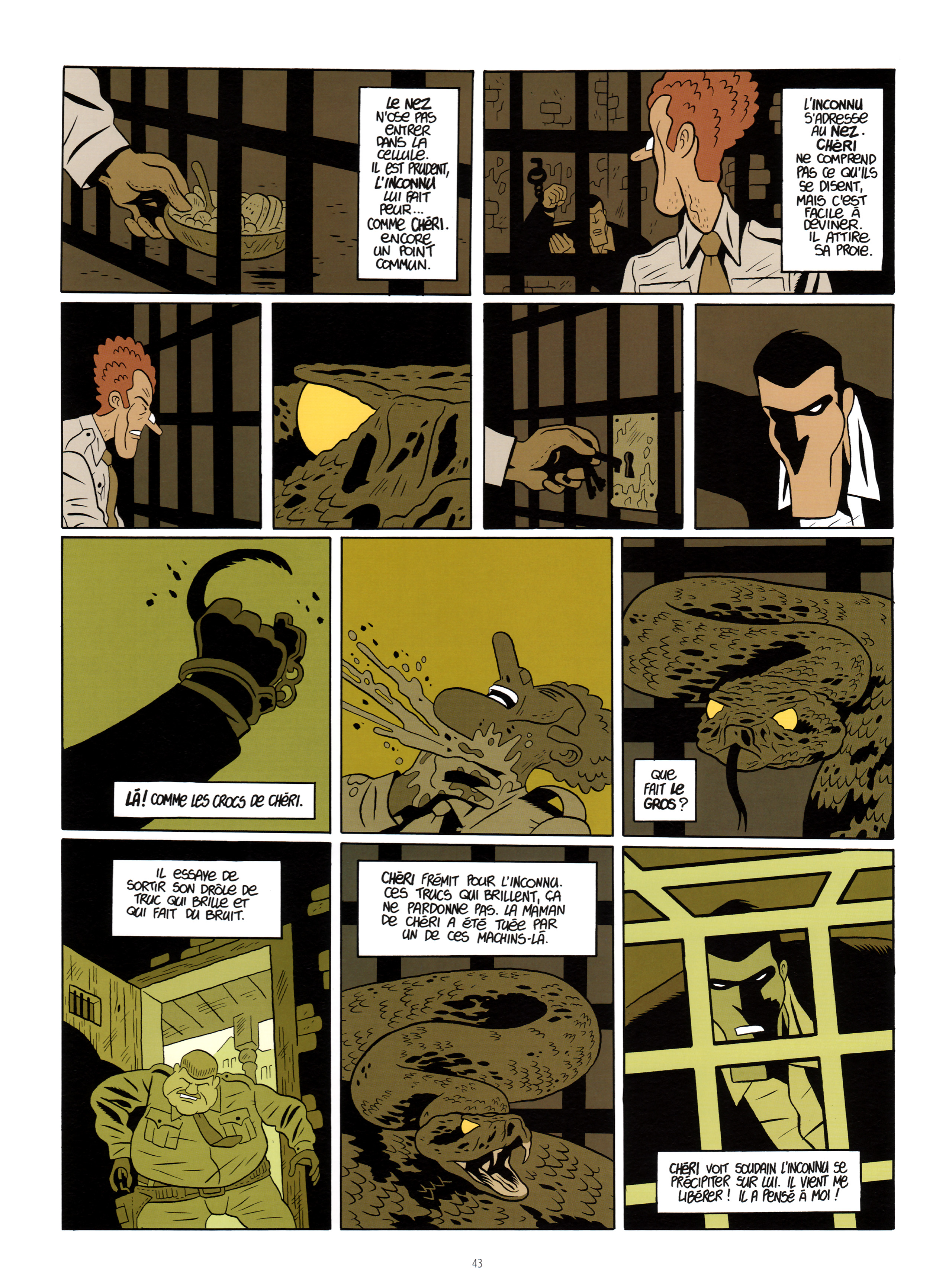 A történet egyik legzseniálisabb pontja, amikor a már említett Chéri, a csörgőkígyó narrálásával lehetünk az események szemtanúi: bár Chéri nem érti, mit mondanak kétlábú fogva tartói, de ahogy ketrecéből figyelemmel kíséri Tyler szökési tervének mozzanatait, egyre több és több hasonlatosságot talál kettejük között, egészen odáig, hogy a katartikus szabadulásakor szinte már ujjongva ünnepli és csodálja kétlábú fajtársát.